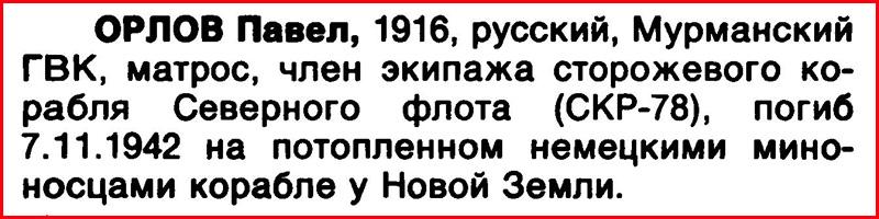 ОРЛОВ Павел, 1916, русский, Мурманский ГВК, матрос, член экипажа сторожевого корабля Северного флота (СКР-78), погиб 7.11.1942 на потопленном немецкими миноносцами корабле у Новой Земли.