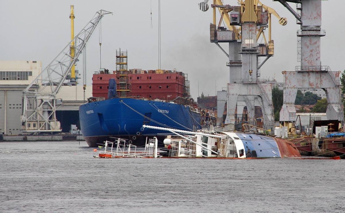 [/img] У причала Балтийского завода в Питере уже больше месяца в водах Невы лежит на боку новый буксир и поднимать его не спешат.