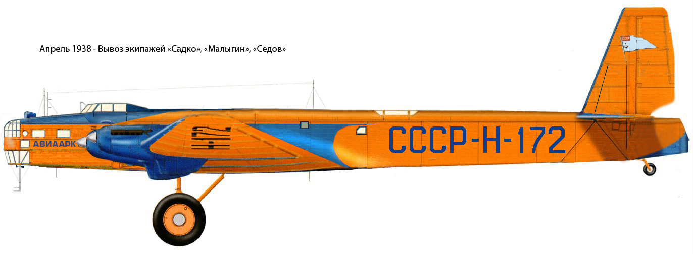 1. Первая конфигурация высадки СП-1 в мае-июне 1937 года - Оранжево голубая ливрея, винты без коков и рамка радиокомпаса внизу под кабиной штурмана. Окраска одинакова с Н-171, единственное видимое отличие - иное начертание и более мелкий шрифт надписи "АВИААРКТИКА" на носу самолета. Выше приведено фото экипажа Н-172 у самолета без надписи в носовой части - есть две версии -некоторое время Н-172 без надписи или экипаж снят у "тренировочного" Н-169 до того как его присоединили с экспедиции и нанесли соответствующую ливрею.