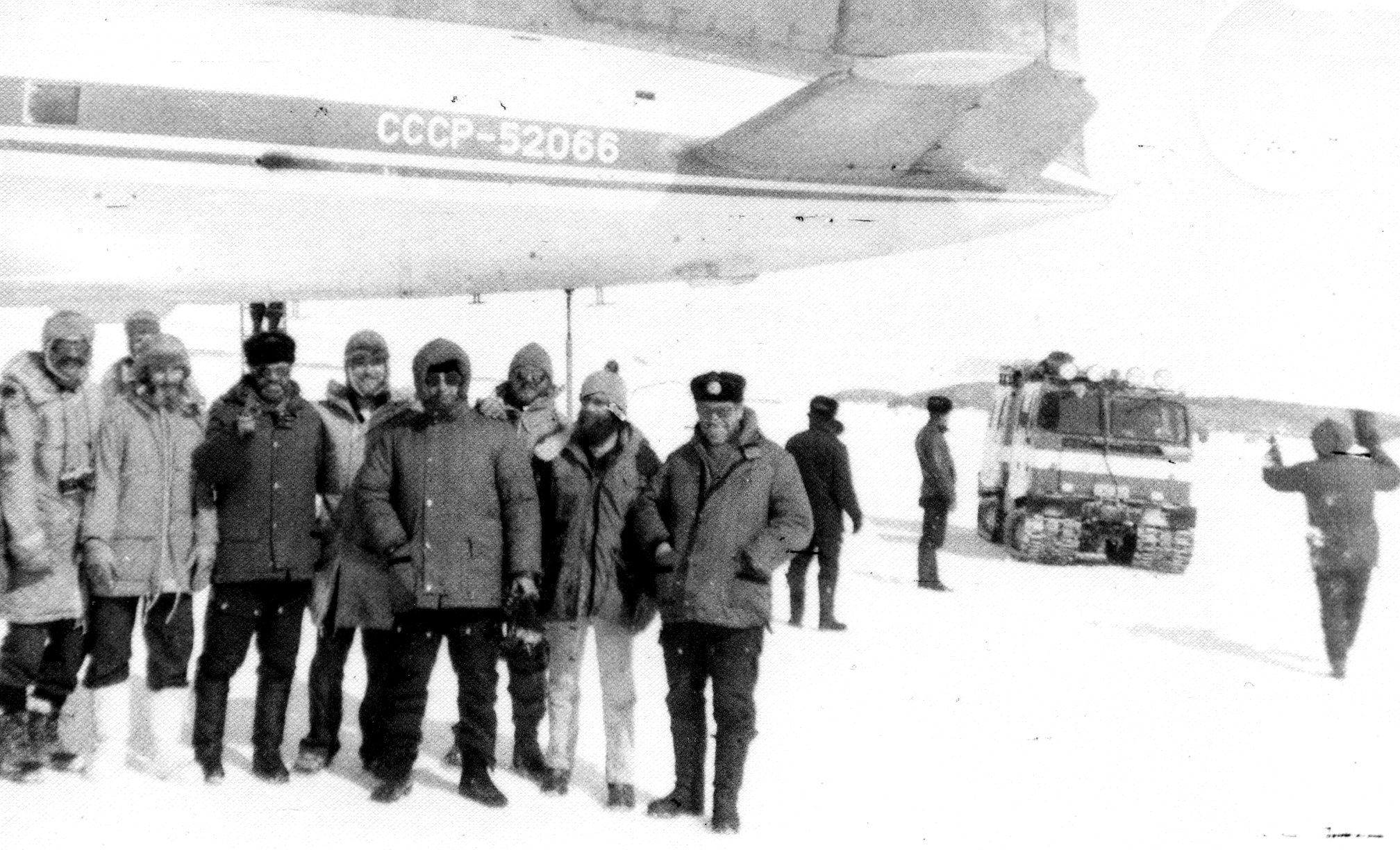 В центре снимка командир корабля Валерий Петрович Гамов, участник многих арктических и, как минимум, двух антарктических экспедиций, сын командира эскадрилии 1 ПАП 1 ПАД Петра Павловича Гамова, одного из немногих летчиков трассы, награжденных орденом Ленина за перегонку самолетов с Аляски.