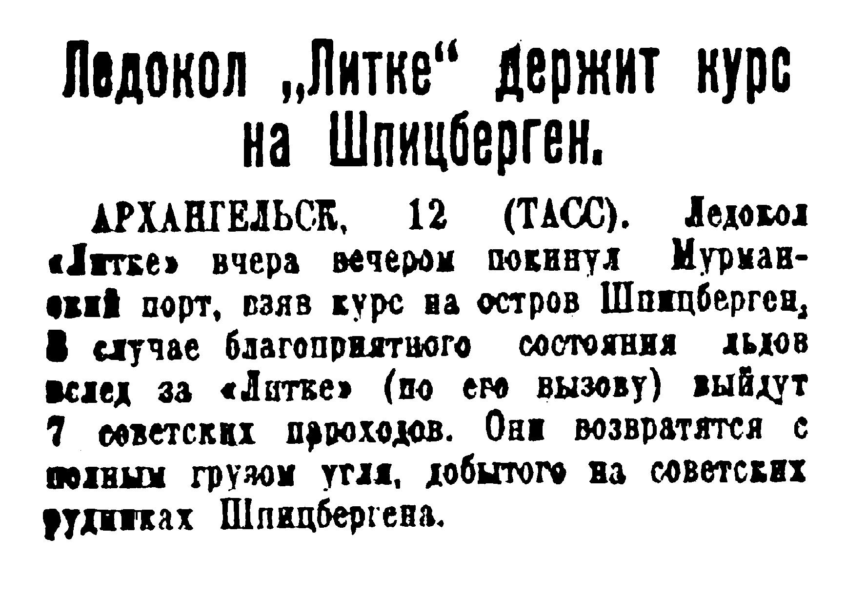 АРХАНГЕЛЬСК, 12 (ТАСС). Ледокол "Литке" вчера вечером покинул Мурманский порт, взяв курс на остров Шпицберген. В случае благоприятного состояния льдов вслед за «Литке» (по его вызову) выйдут 7 советских пароходов. Они возвратятся с полных грузом угля, добытого на советских рудниках Шпицбергена.
