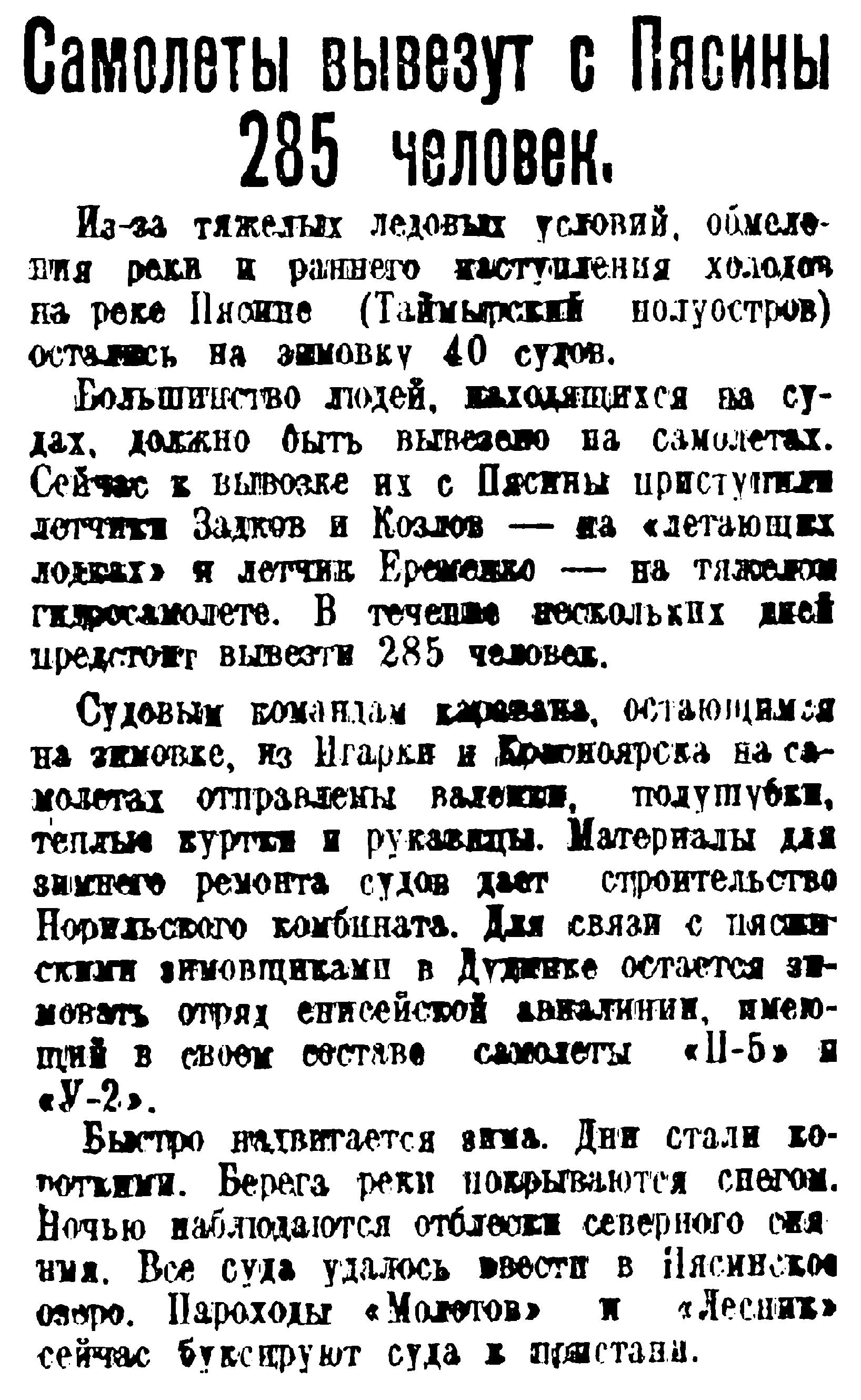 По заявлению начальника красноярского политотдела Северного морского пути тов. Чвокова, всему каравану вследствие тяжелых ледовых условий этого года, продолжающегося обмеления реки и раннего наступления холодов придется остаться на зимовку в верховьях Пясины. Для ремонта судов решено оставить здесь 120 рабочих. Остальных предполагается на тяжелых морских самолетах отправить в Дудинку, а оттуда с последними пароходами — в Красноярск. Самолеты забросят пясинским зимовщикам теплую одежду, обувь, продовольствие.