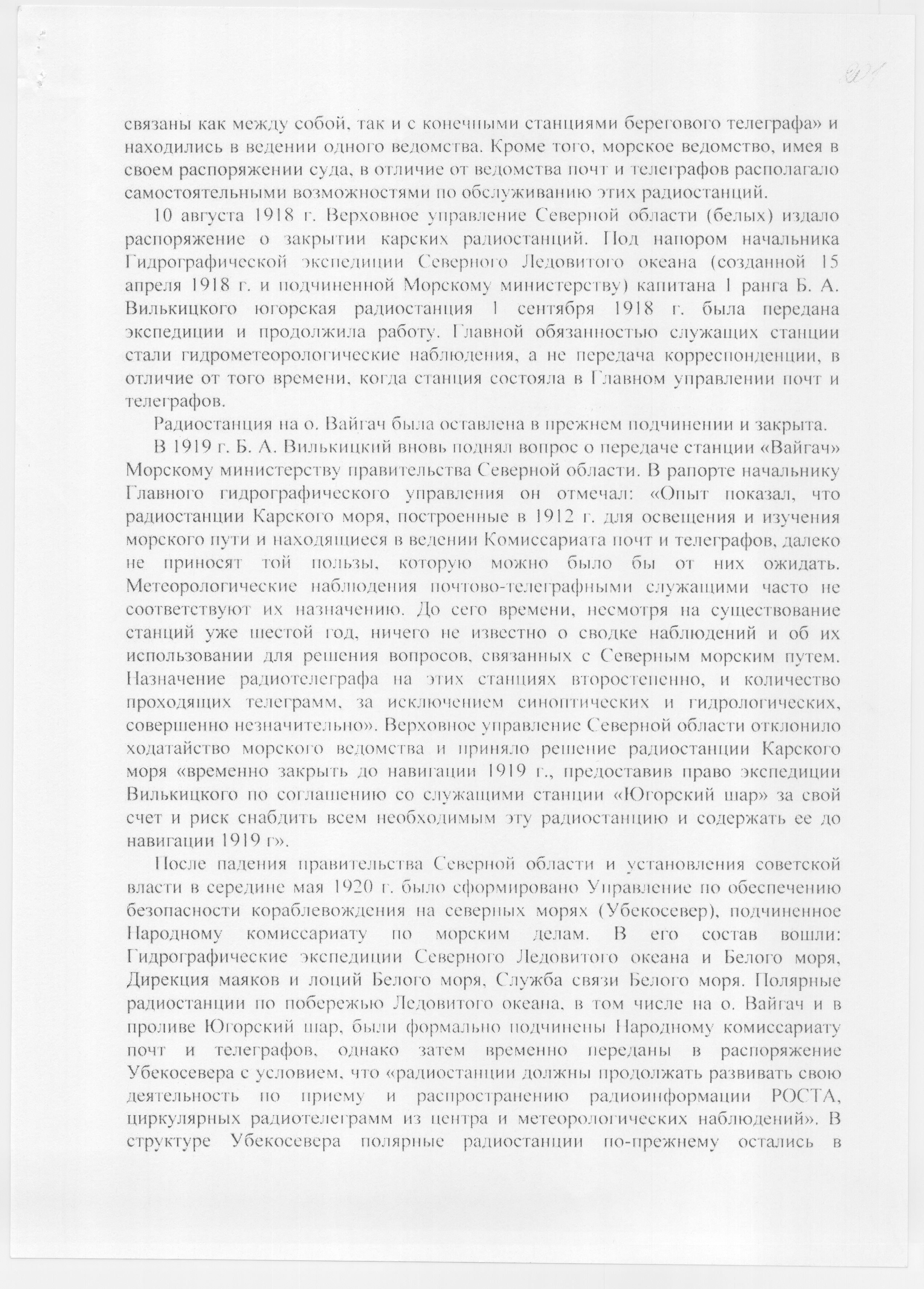В 1919 г. Б, Д. Велькицкий вновь поднял вопрос о передаче станции «Вайгач» Морскому министерству правительства Северной области. В рапорте начальнику Главного гидрографического управления он отмечал: «Опыт показан, что радиостанции Карскою моря, построенные в 1912 г. для освещения и изучения морского пути и находящиеся в ведении Комиссариата почт и телеграфов, далеко не приносят той пользы, которую можно было бы от них ожидать. Метеорологические наблюдения почтово-телеграфными служащими часто не соответствуют их назначению. До сего времени, несмотря на существование станций уже шестой год, ничего не известно о сводке наблюдений и об их использовании для решения вопросов, связанных с Северным морским путем. Назначение радиотелеграфа на этих станциях второстепенно, и количество проходящих телеграмм, за исключением синоптических и гидрологических, совершенно незначительно». Верховное управление Северной области отклонило ходатайство морского ведомства и приняло решение радиостанции Карского моря «временно закрыть до навигации 1919 г., предоставив право экспедиции Вилькицкого по соглашению со служащими станции «Югорский шар» за свой счет и риск снабдить всем необходимым эту радиостанцию и содержать ее до навигации 1919 г».