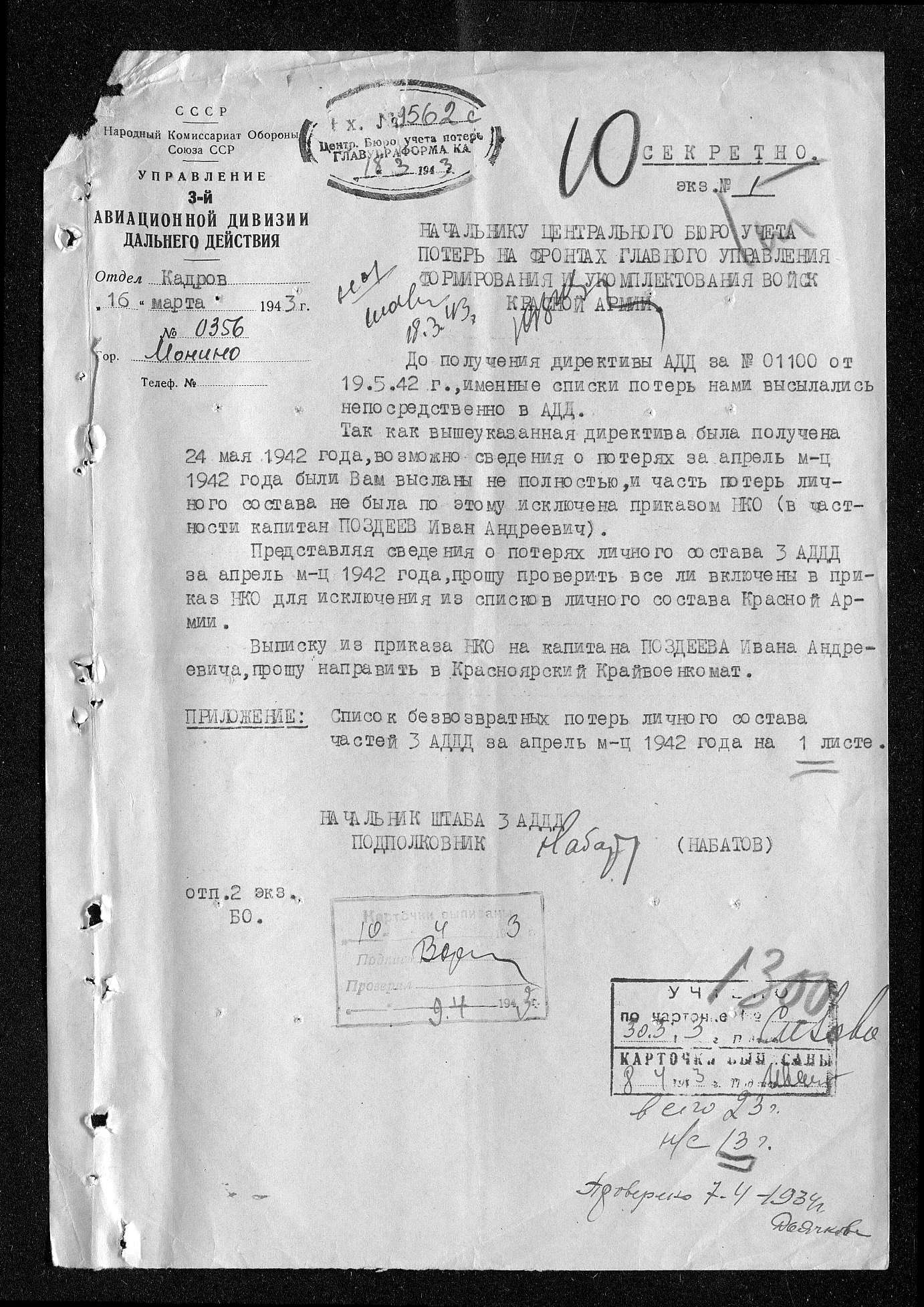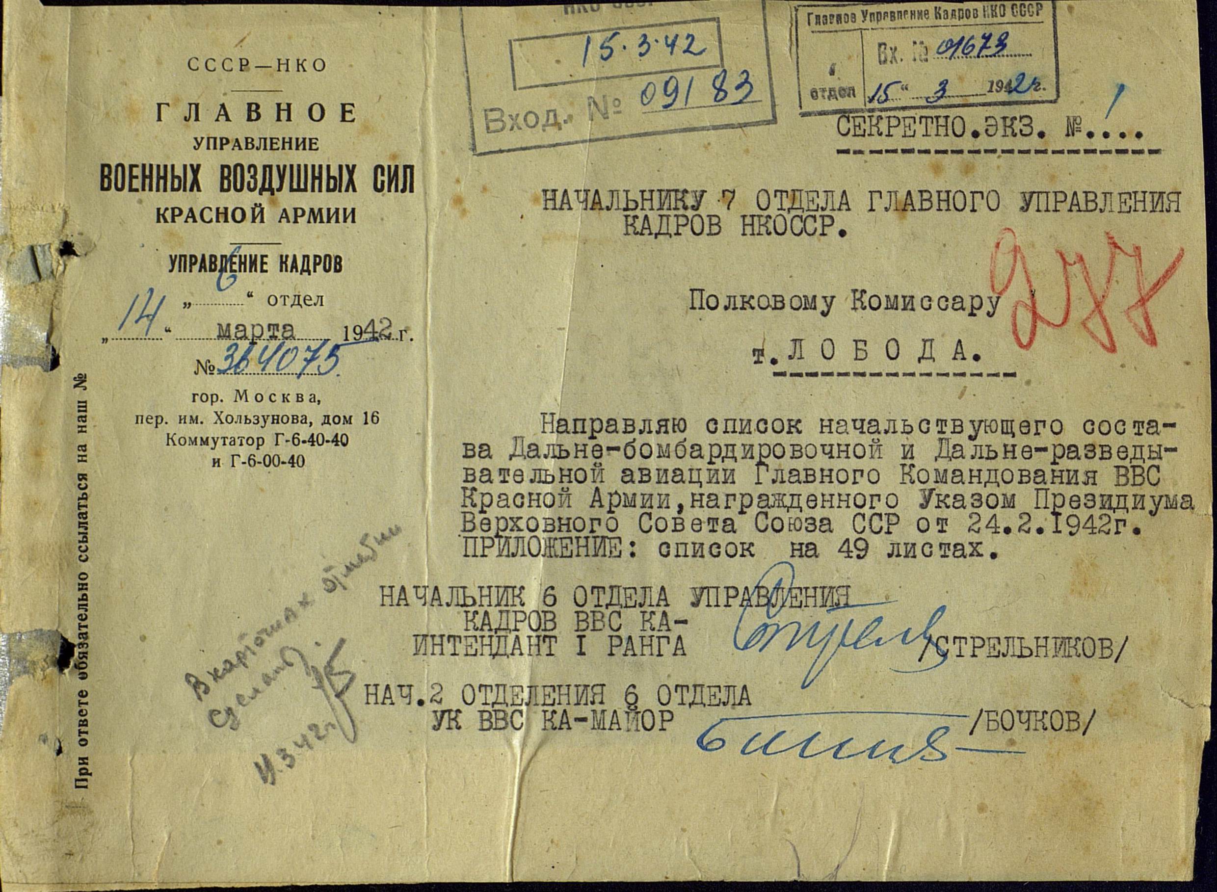 1) 3 авиационная дивизия дальнего действия в ночь с 15 на 16.4.1942 года произвела 12 самолётовылетов. 11 самолётов задачу выполнили и произвели посадку на своих аэродромах.