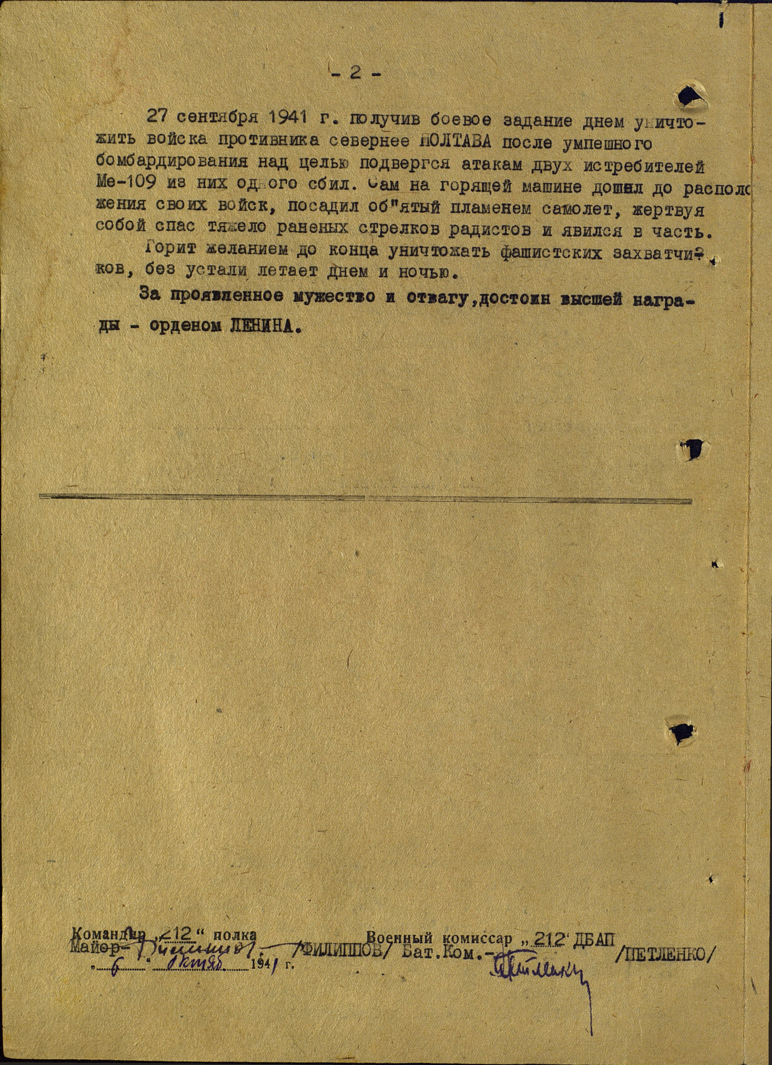 «Наши самолёты по очереди бомбили немецкий аэродром весной 1942 года. Сбитый самолёт бомбил аэродром одним из последних. После бомбометания лётчики снизились на малую высоту и стали расстреливать уцелевшие машины врага из пулемётов. Несколько машин вспыхнули, но самолёт продолжал кружить над аэродромом. Через некоторое время гитлеровцы пришли в себя и открыли огонь из всех видов зенитной артиллерии. Одной из очередей самолёт храбрецов был подбит, и горящая машина упала прямо на лётное поле».