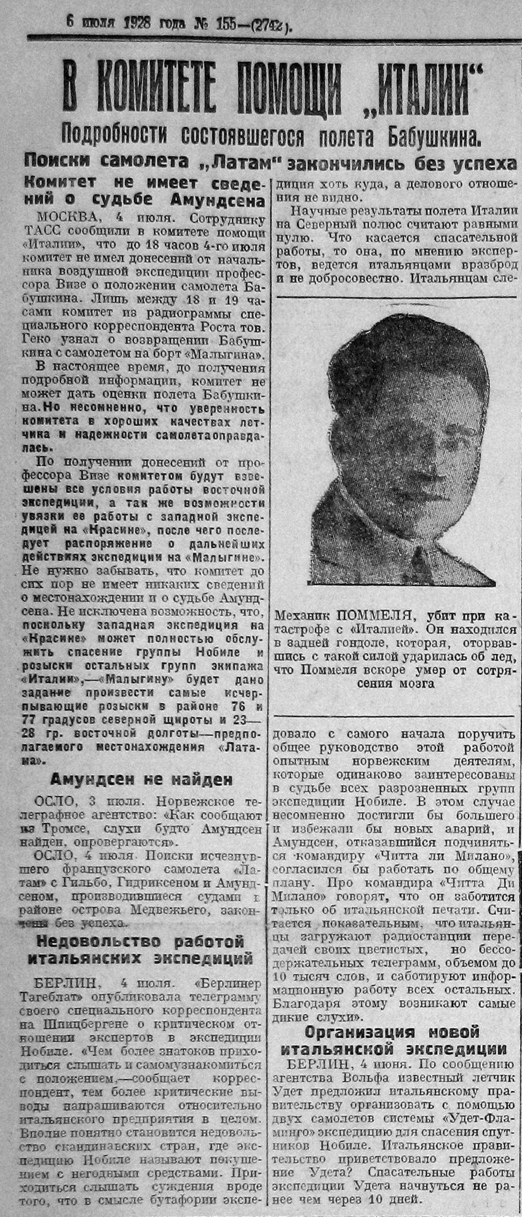 Механик ПОММЕЛЯ, убит при катастрофе с «Италией». Он находился в задней гондоле, которая, оторвавшись с такой силой ударилась об лед, что Поммеля вскоре умер от сотрясения мозга.