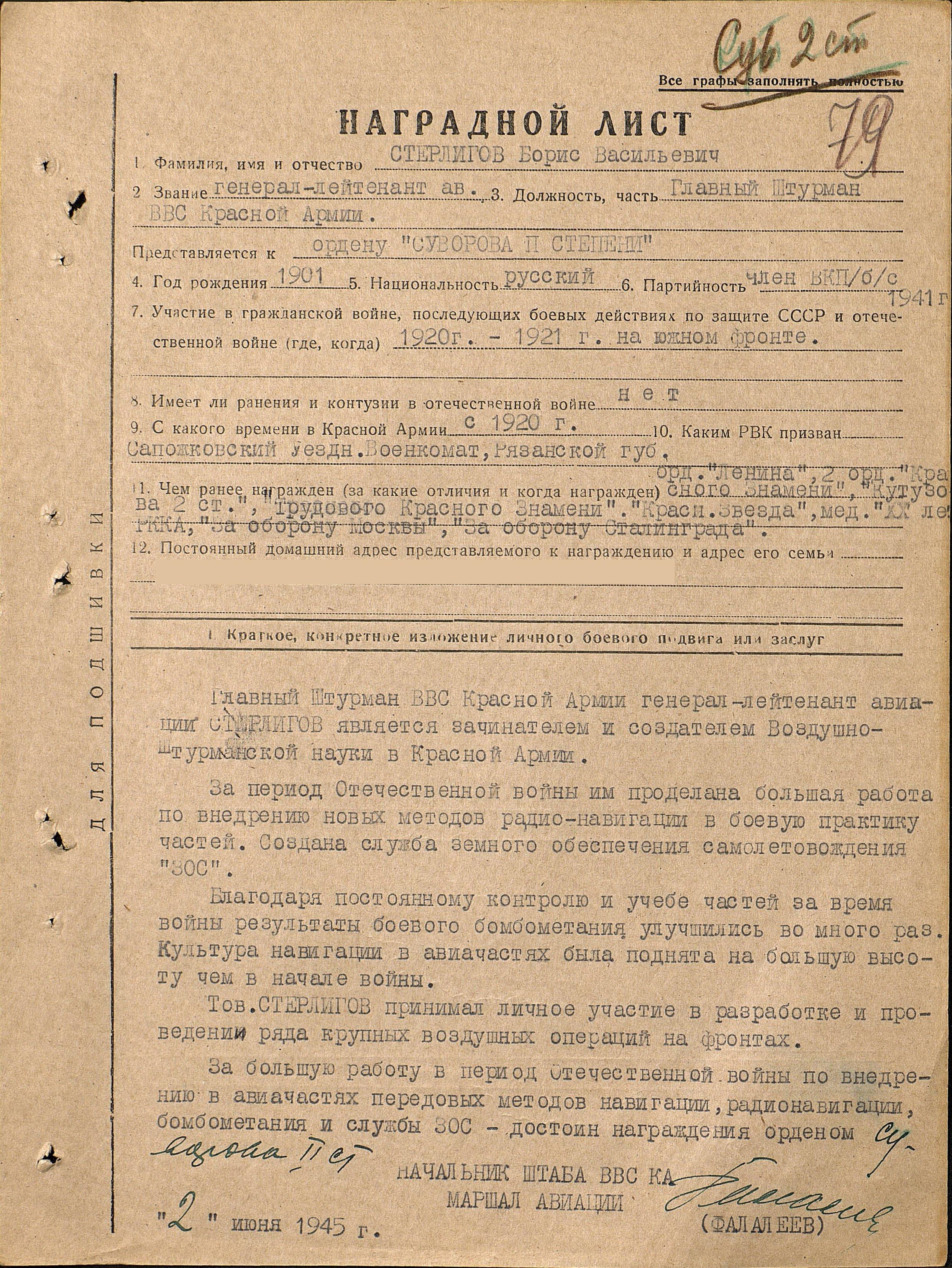 07.06.43 г. приказом No.68 командующего ВВС КА было введено, подготовленное Б.В. Стерлиговым на основе опыта войны, новое Наставление по штурманской службе – НШС-43. С этим наставлением авиация воевала до конца войны. К концу войны благодаря штурманской службе надежность навигации повысилась по сравнению с довоенным временем более чем в четыре раза, надежность выхода на цель в пять раз, меткость бомбометания на 74%.