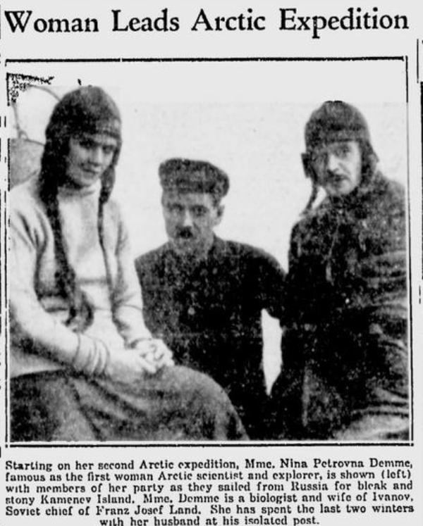 — Арктика до сих пор была особенно недоступной для женщины, и история не знает ни одной исследовательницы в широтах далекого Севера, — говорит тов. Демме. — Только Союз советских социалистических республик за все века в истории посылает свою работницу в числе членов правительственной арктической экспедиции на 82 градус, северной широты на научно-исслеловательскую работу.