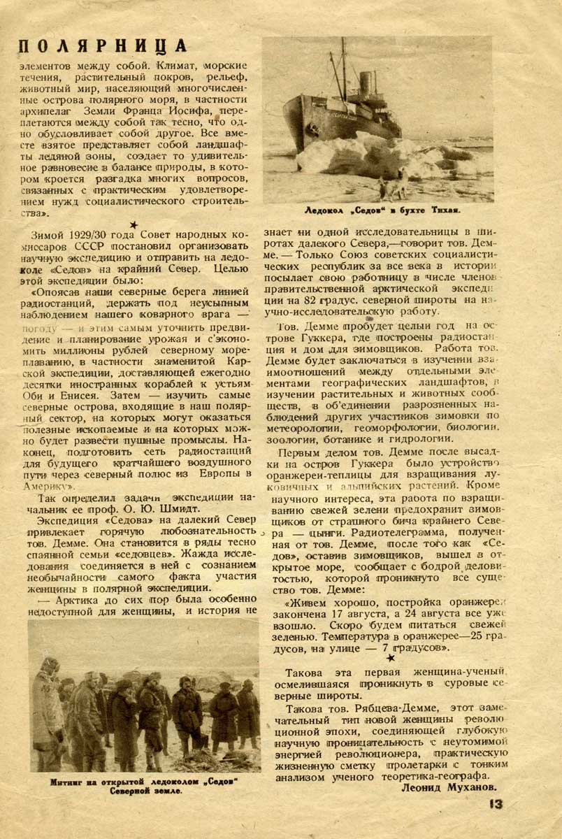 — Арктика до сих пор была особенно недоступной для женщины, и история не знает ни одной исследовательницы в широтах далекого Севера, — говорит тов. Демме. — Только Союз советских социалистических республик за все века в истории посылает свою работницу в числе членов правительственной арктической экспедиции на 82 градус, северной широты на научно-исслеловательскую работу.