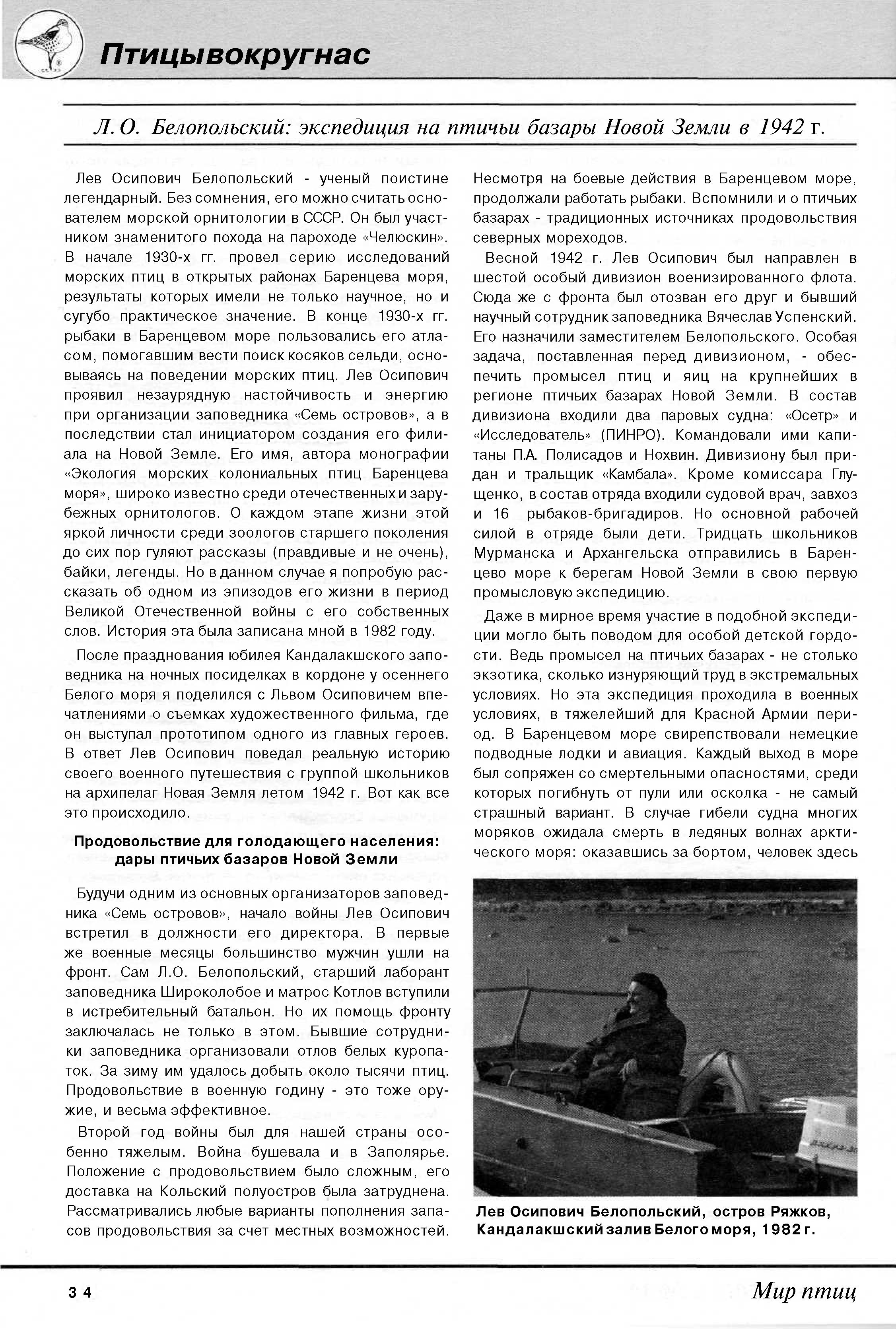 Л. О. Белопольский экспедиция на птичьи базары Новой Земли в 1942 г.Лев Осипович Белопольский - ученый поистине легендарный. Без сомнения, его можно считать основателем морской орнитологии в СССР. Он был участником знаменитого похода на пароходе «Челюскин».