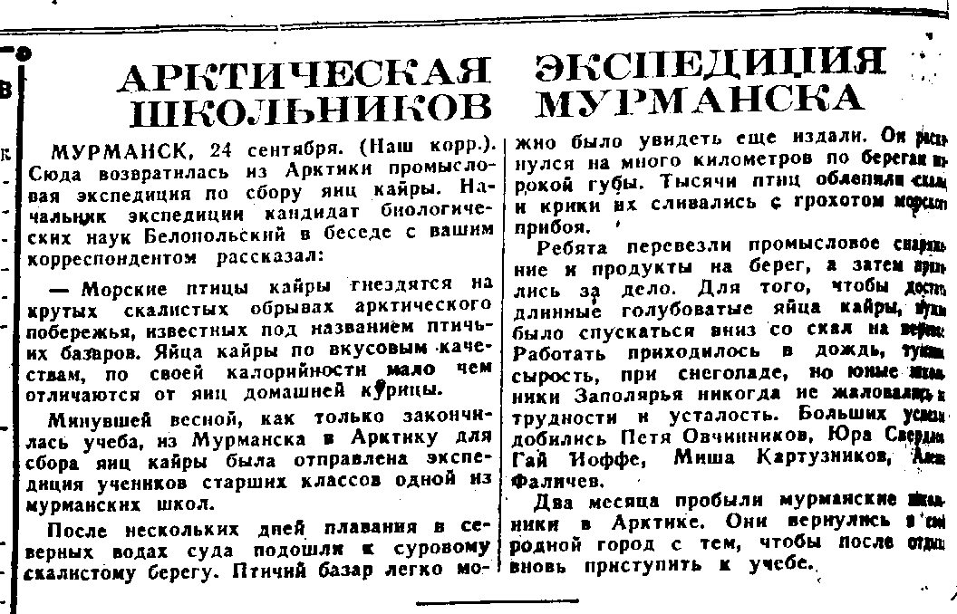 Даже в мирное время участие в подобной экспедиции могло быть поводом для особой детской гордости. Ведь промысел на птичьих базарах - не столько экзотика, сколько изнуряющий труд в экстремальных условиях. Но эта экспедиция проходила в военных условиях, в тяжелейший для Красной Армии период. В Баренцевом море свирепствовали немецкие подводные лодки и авиация. Каждый выход в море был сопряжен со смертельными опасностями, среди которых погибнуть от пули или осколка - не самый страшный вариант. В случае гибели судна многих