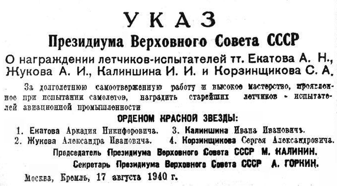 О награждении летчиков-испытателей тт. Екатова А. Н., Жукова А. И., Калиншина И. И. и Корзинщикова С. А.