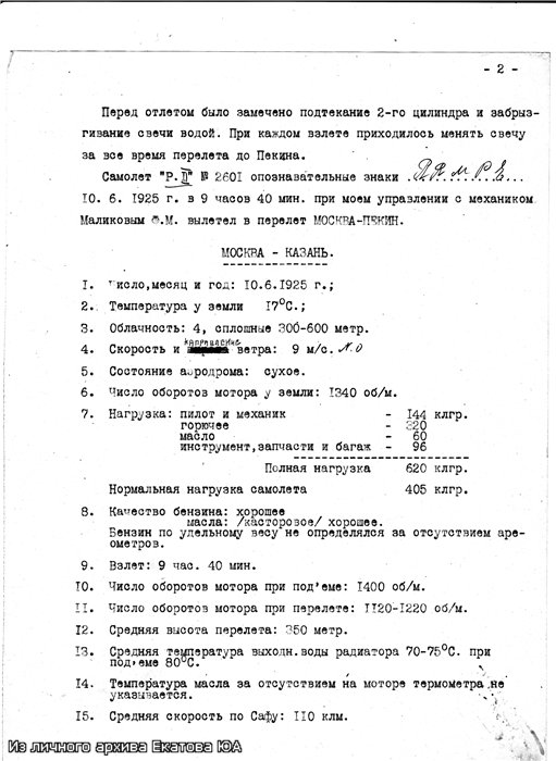 Самолет "Р.II" № 2601 опознавательные знаки R-RMPE 10. 6. 1925 г. в 9 часов 40 мин. при моем управлении с механиком Маликовым Ф.М. вылетел в перелет МОСКВА-ПЕКИН.