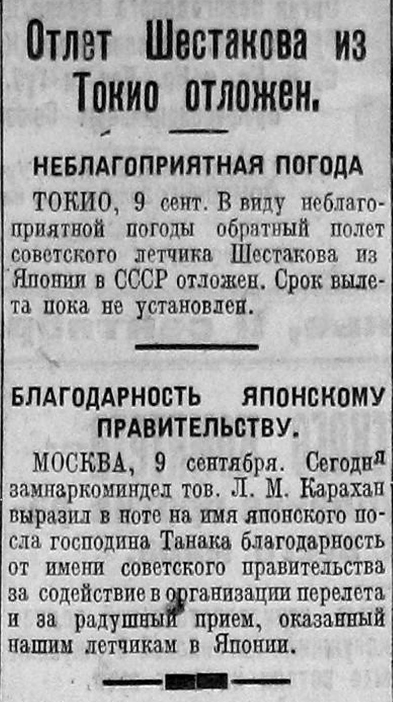 ТОКИО, 8 сентября. Агентство Симбун Ренго сообщает: «Аппарат советского летчика Шестакова, имея на борту поверенного в делах СССР Беседовского, совершил прощальный полет над Токио, разбрасывая тысячи летучек с прощальным приветствием и уверениями в дружбе. Если погода будет благоприятствовать, Шестаков вылетит в обратный путь 9 сентября.