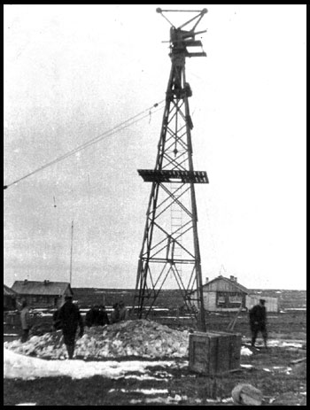 Сборка Д-8 на Диксоне. Фото из "Советской Арктики" (1935, №5). Интересно, что рабочая площадка башни круглая. Позже у всех ветряков 30-50-х гг. они были квадратными - круглую досками зашивать труднее.