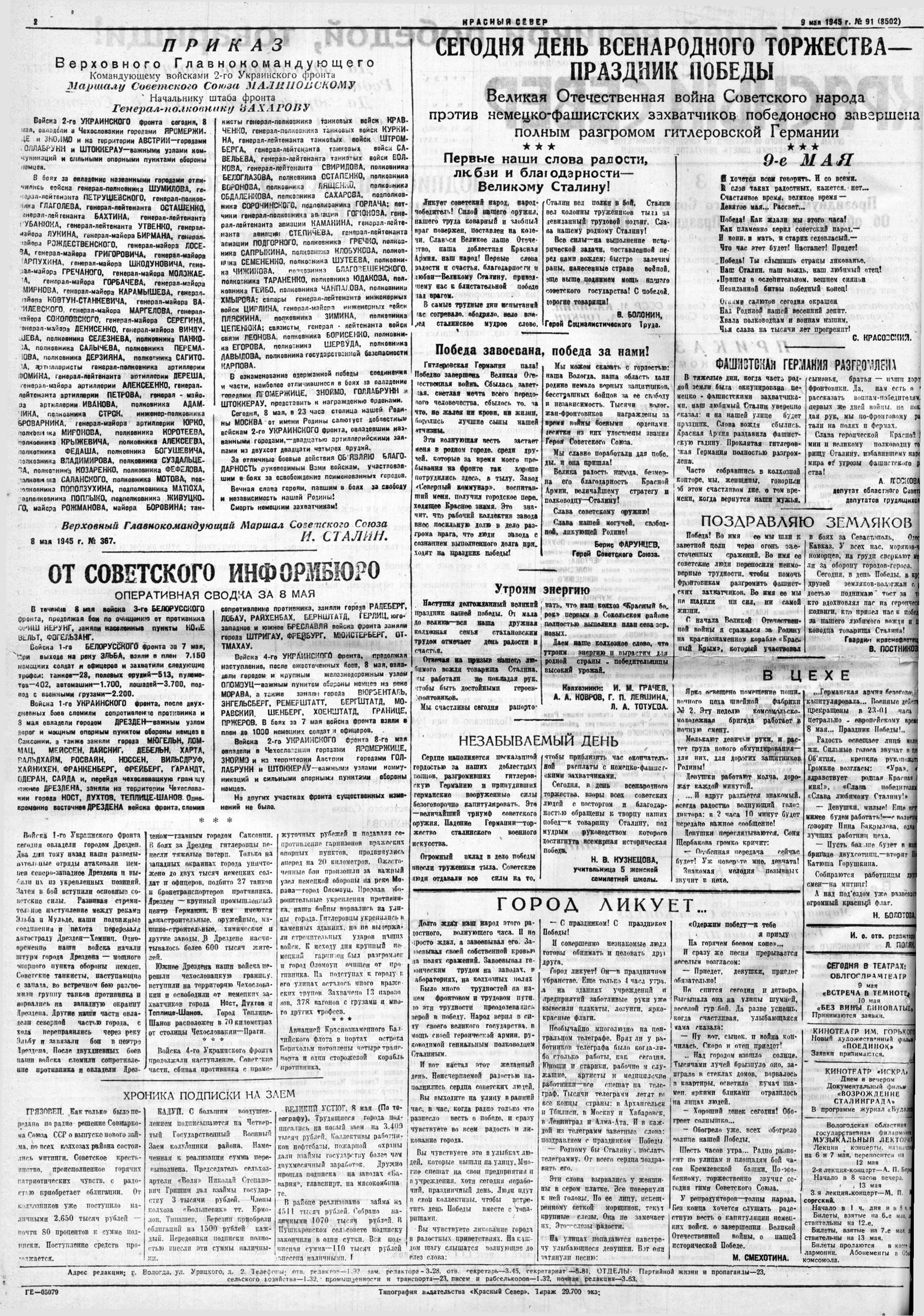 Сегодня - праздник Победы. Мы пришли из редакции (я как раз дежурил вчера) в 10 ч. утра, но в 4 ч. все уже снова были в редакции. Весь день - радостные звонки.