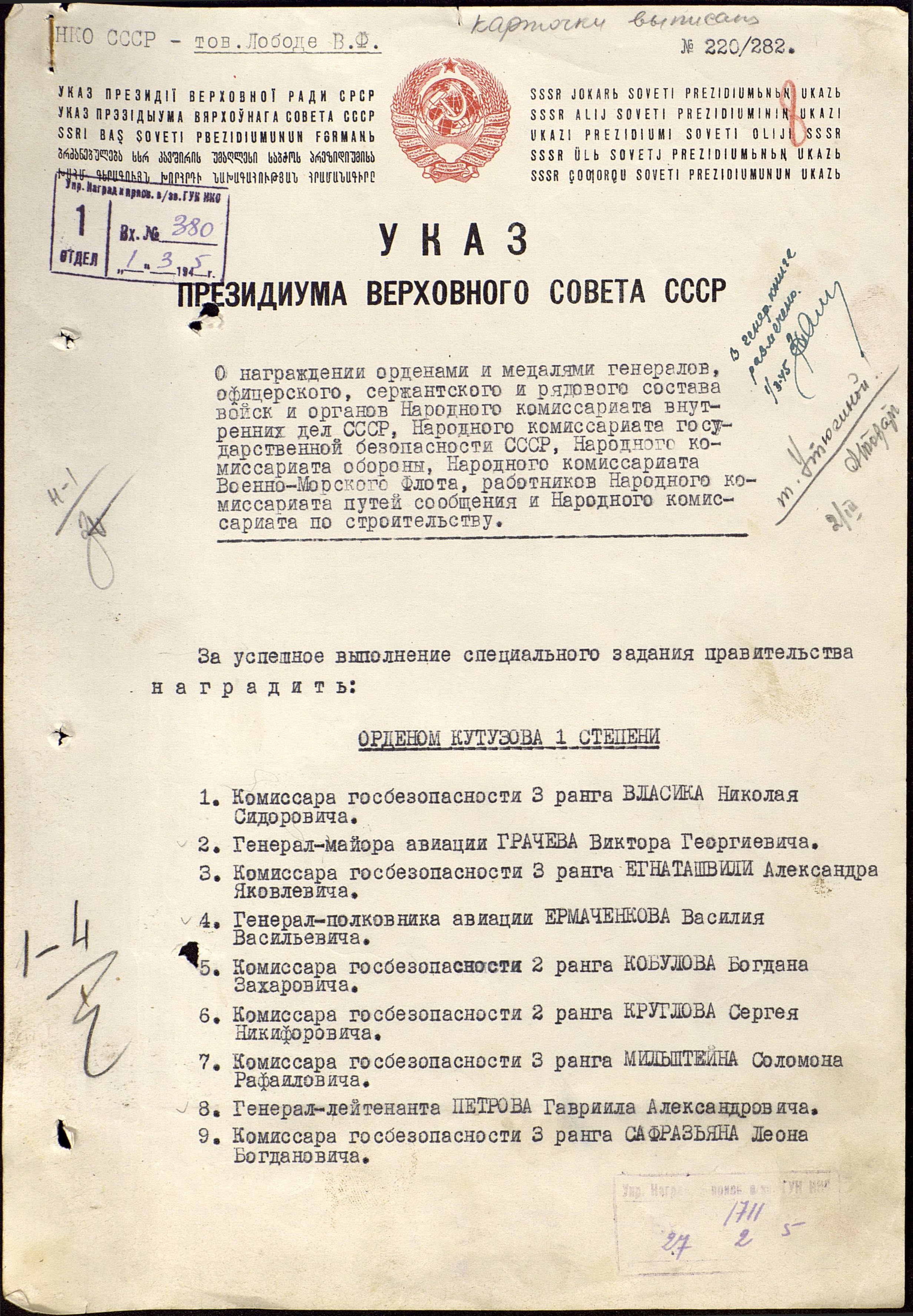 В соответствие с «Положением о прохождении военной службы офицерским составом СА» уволить из кадров СА в запас: по ст. 59, п. «а» - по выслуге … с правом ношения формы с особыми отличительными знаками на погонах - … 3. Полковника Цуцаева Владимира Александровича, состоящего в прикомандировании к ГУСМП ММФ СССР.
