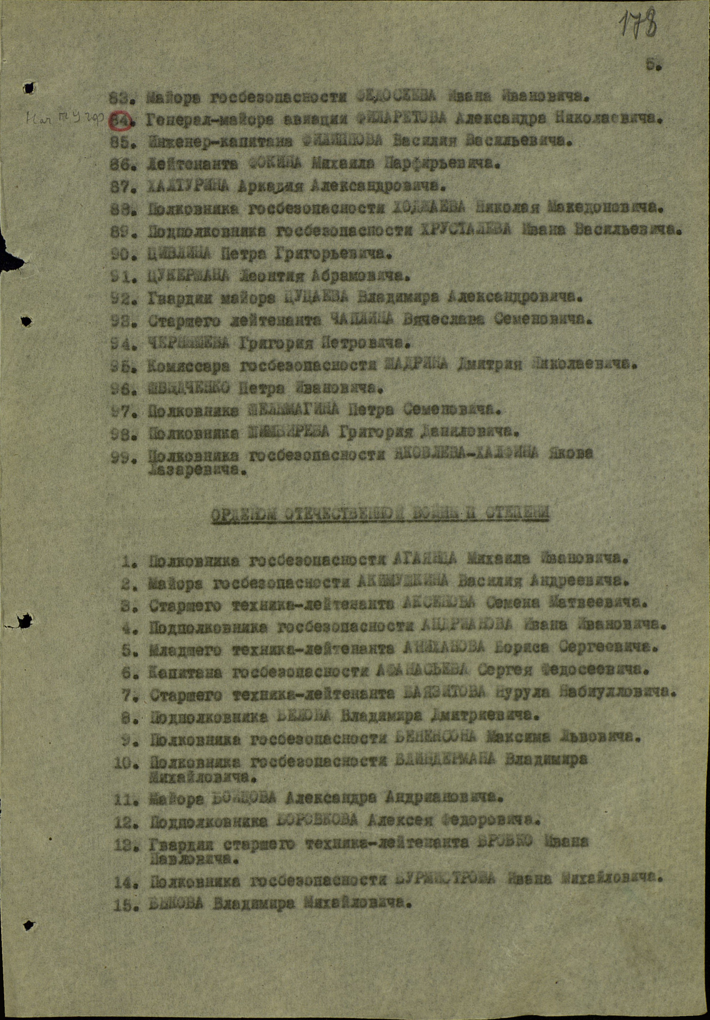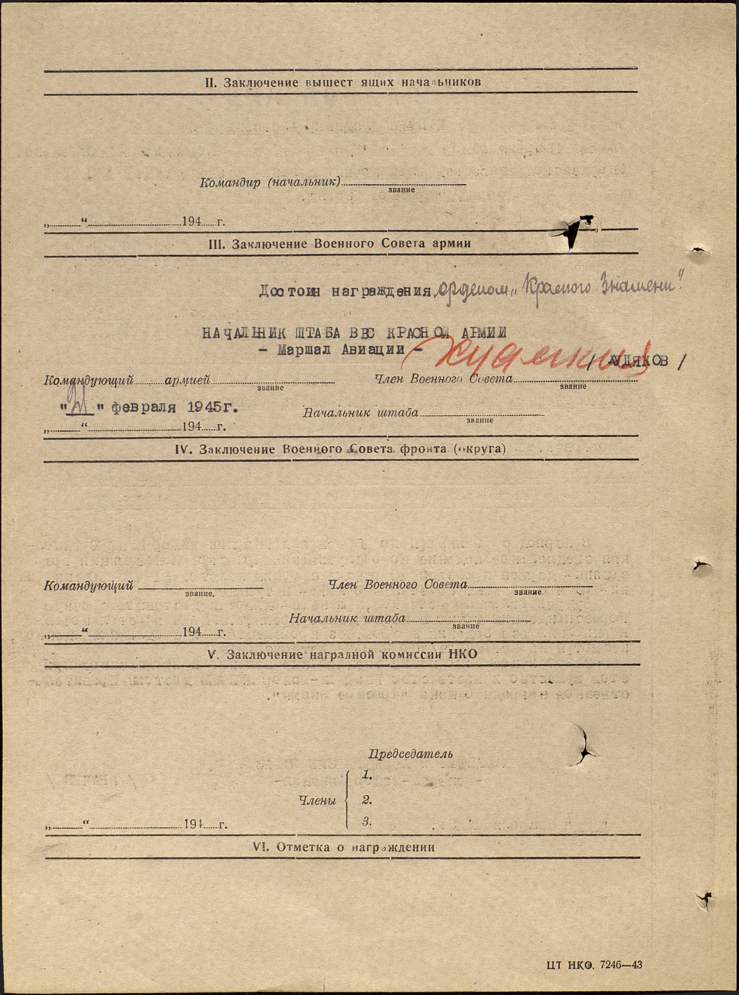 1908 г.р. В СА прослужил 23г.7м. (в льготном исчислении 43г.10м.). Подлежит направлению на учёт в Ленинградский райвоенкомат г. Москвы.
