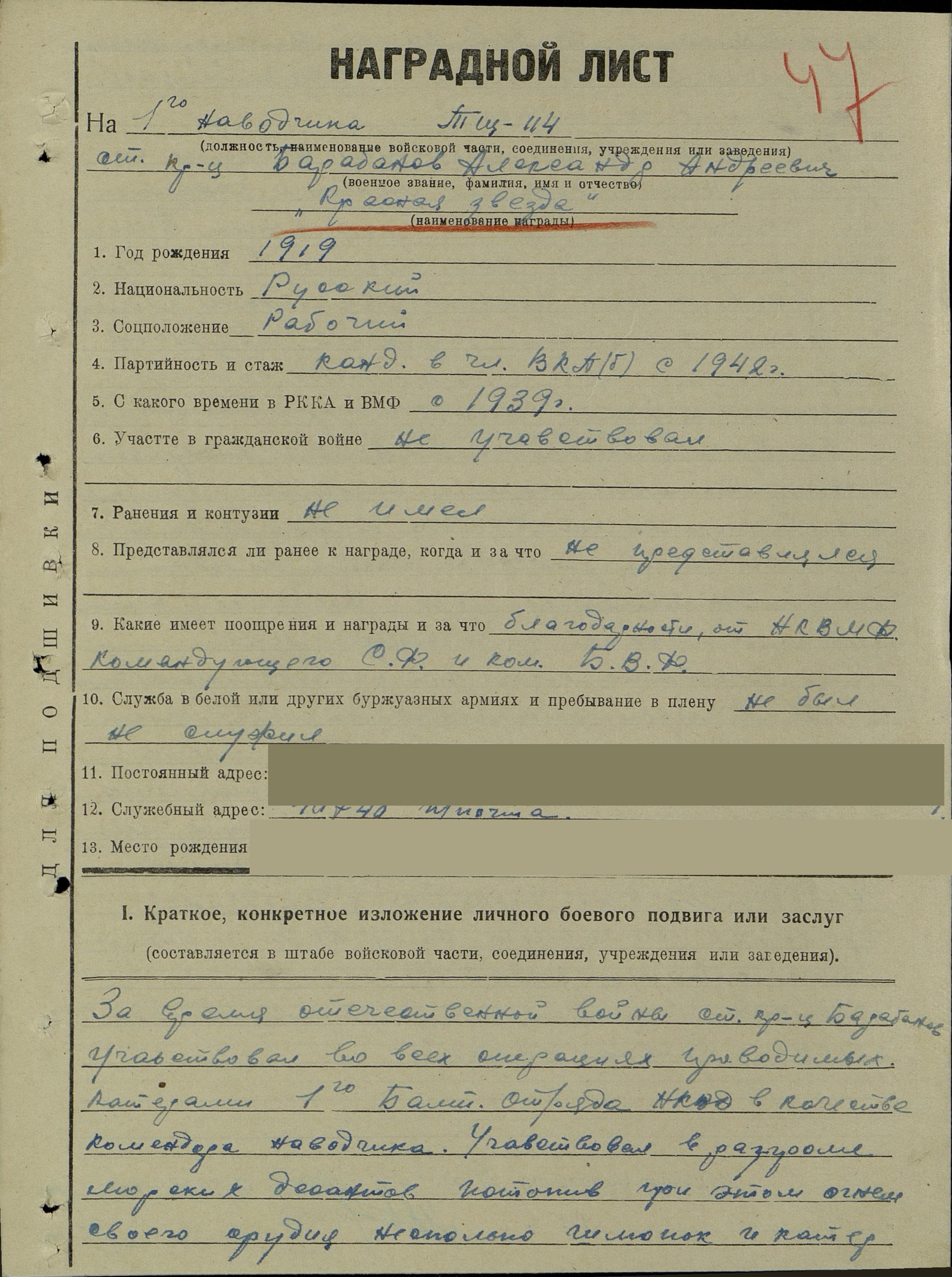 Барабанов Александр Андреевич, воинское звание – ст. краснофлотец; должность (специальность), часть – комендор 3 кл., тральщик ТЩ-114 6 ДТЩ Бригада траления ОВР ГБ СФ; год рождения – 1919; место рождения – Ивановская обл., Фурмановский р-н (г. Фурманов); партийность – член ВЛКСМ (кандидат в члены ВКП(б) с 1942 г.); социальное положение – рабочий; национальность – русский; срок срочной службы – 1940 г. (1939); каким РВК призван – Фурмановским РВК; награды – орден Красной Звезды; по какой причине, где и когда выбыл – погиб в море при выполнении боевого задания 12.08.1944 г.; служебный адрес – п/п 40740; семейное положение – холост; родственники (ФИО, адрес) – сестра, Барабанова Полинария (Полинарья) Андреевна, Фурмановский р-н, с. Дзержинск (Дзержинское), д. 27; дополнительная информация – имел благодарности от НК ВМФ, командующего СФ, командующего БВФ, участвовал в операциях, проводимых катерами 1 Балтийского отряда НКВД, в качестве комендора наводчика участник выполнения правительственного задания по приемке и переводу корабля из США в СССР, участник потопления двух ПЛ противника. Его сестра, Погодина Полина Андреевна, жила в 70–80-е годы прошлого века по адресу: 157760, Костромская обл., пос. Вохма, ул. Горького, д. 13, кв. 2.