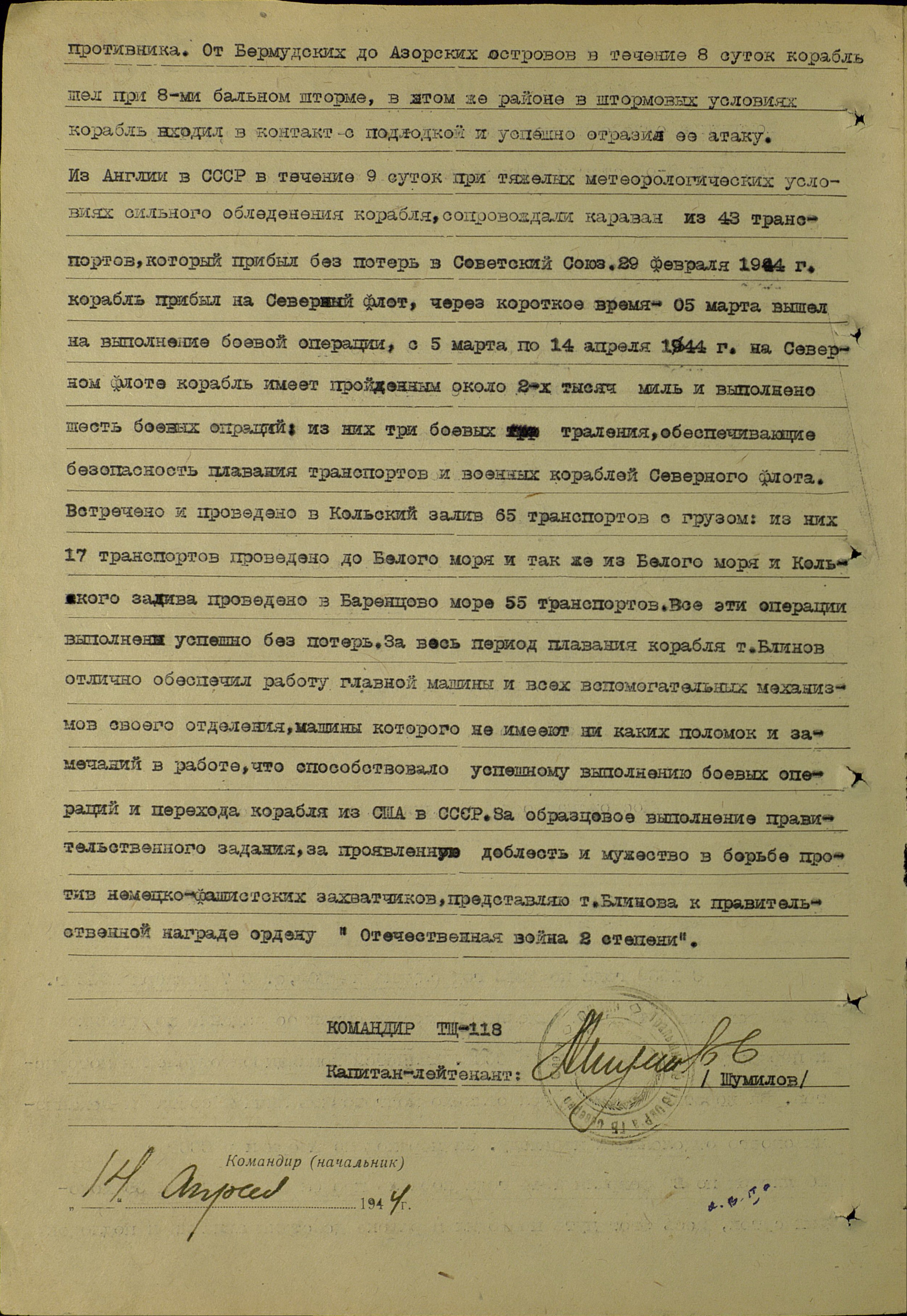Из Англии в СССР в течение 9 суток при тяжелых метеорологических условиях, сильного обледенения корабля сопровождали караван из 43 транспортов, который прибыл без потерь в Советский Союз. 29 февраля 1944 г. корабль прибыл на СФ, через короткое время – 5 марта – вышел на выполнение боевой операции, с 5 марта по 14 апреля 1944 г. на СФ корабль имеет пройденными 2000 мили и выполнил 6 боевых операций, из них 3 боевых траления, обеспечивающих безопасность плавания транспортов и военных кораблей СФ. Встречено и проведено в Кольский залив 65 транспортов с грузом, из них 17 транспортов проведено до Белого моря и так же из Белого моря и Кольского залива проведено в Баренцево море 55 транспортов. Все эти операции выполнены успешно без потерь. За весь период плавания корабля тов. Блинов отлично обеспечил работу главной машины и всех вспомогательных механизмов своего отделения, машины которого не имеют ни каких поломок и замечаний в работе, что способствовало успешному выполнению боевых операций и перехода корабля из США в СССР.