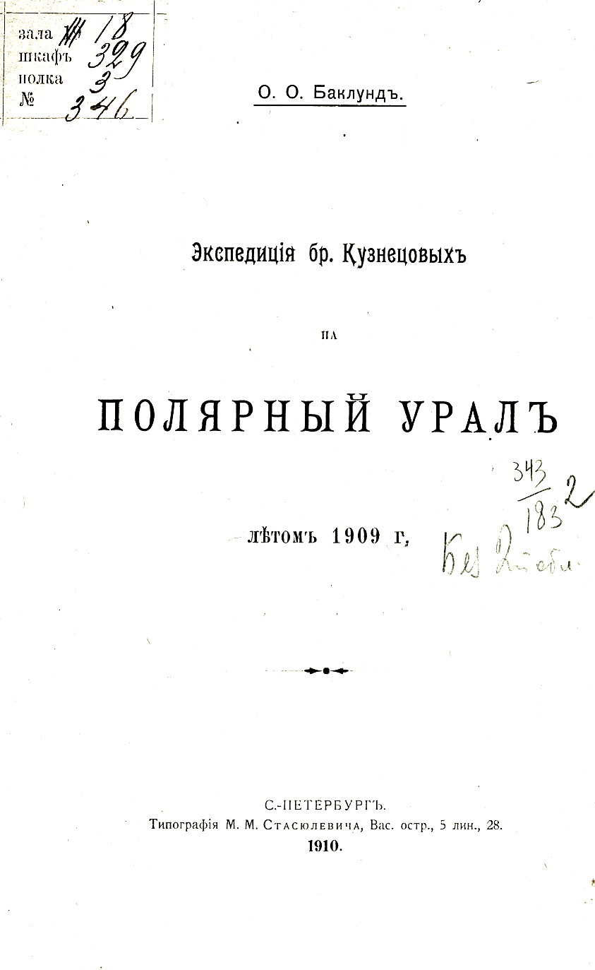 Баклунд О. О. Экспедиция бр. Кузнецовых на Полярный Урал летом 1909 г. /О.О. Баклунд. - Санкт-Петербург : тип. М.М. Стасюлевича, 1910. - 17 с.