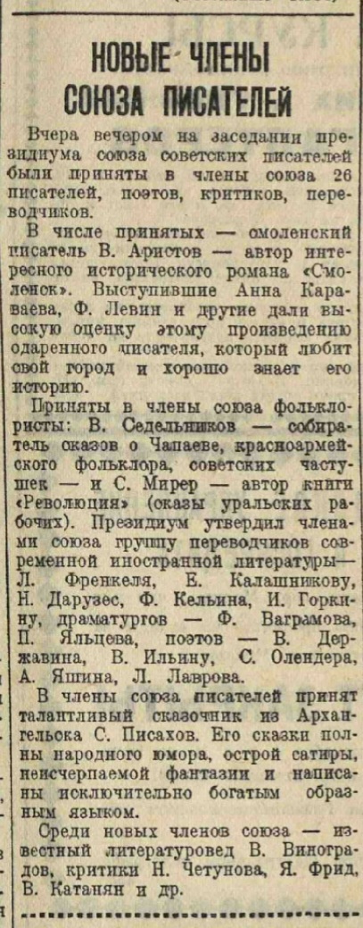 В члены союза писателей принят талантливый сказочник из Архангельска С. Писахов. Его сказки полны народного юмора, острой сатиры, неисчерпаемой ‘фантазии и написаны исключительно богатым образным языком.