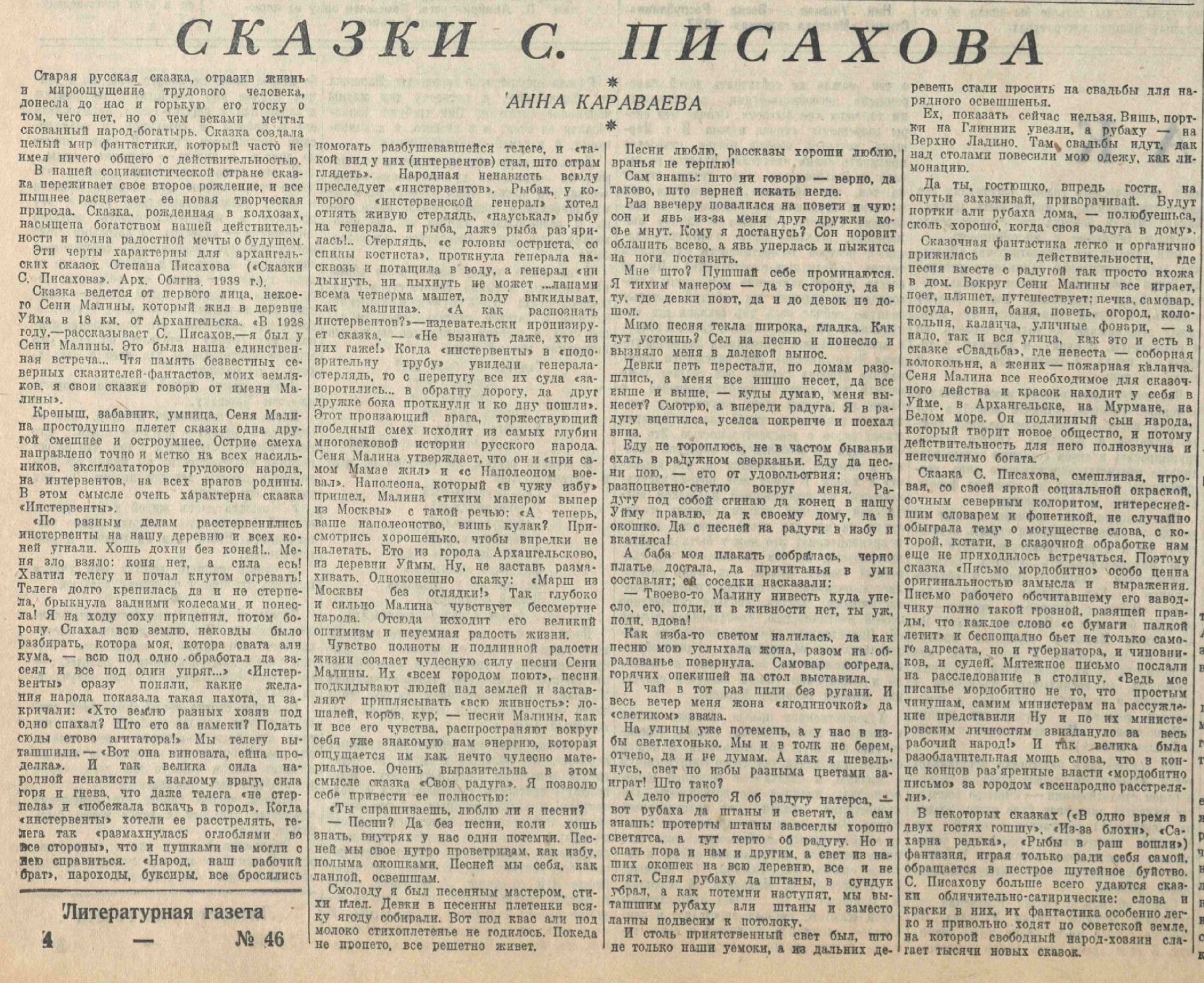 Караваева А. Сказки С. Писахова//Литературная газета, август 20, 1939, № 46 (825)