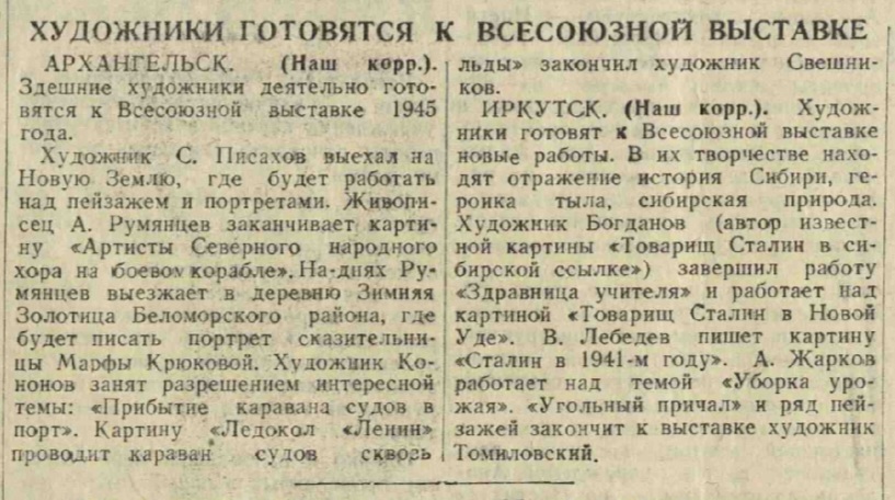 Художники готовятся к всесоюзной выставке//Советское искусство, 27 июля, 1945, № 30 (962)