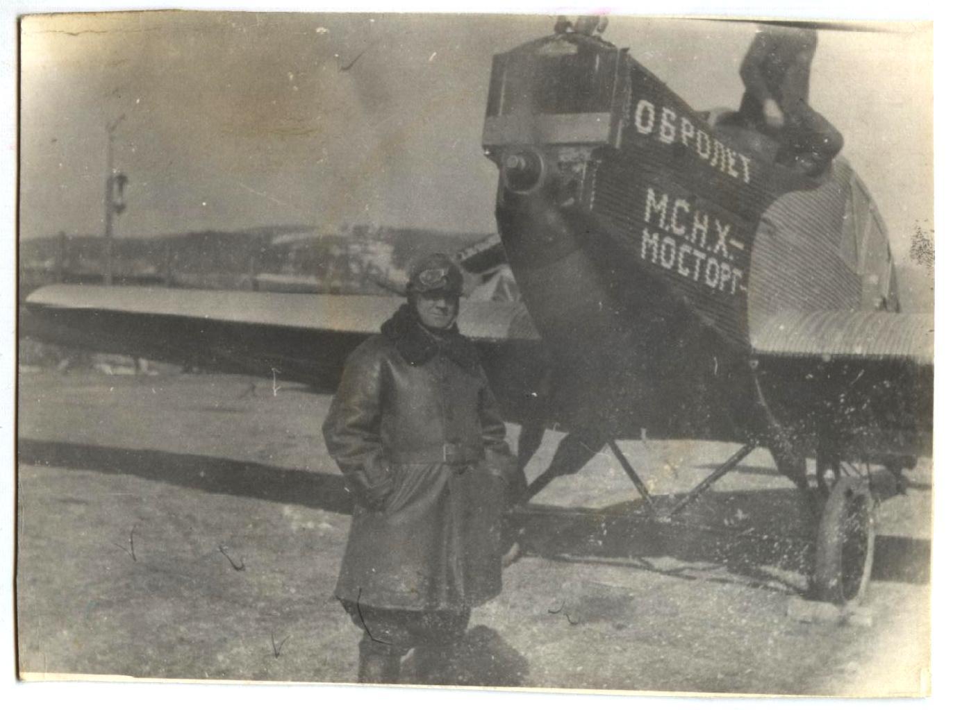 О.А. Кальвица стоит перед самолётом по имени "Мосторг".