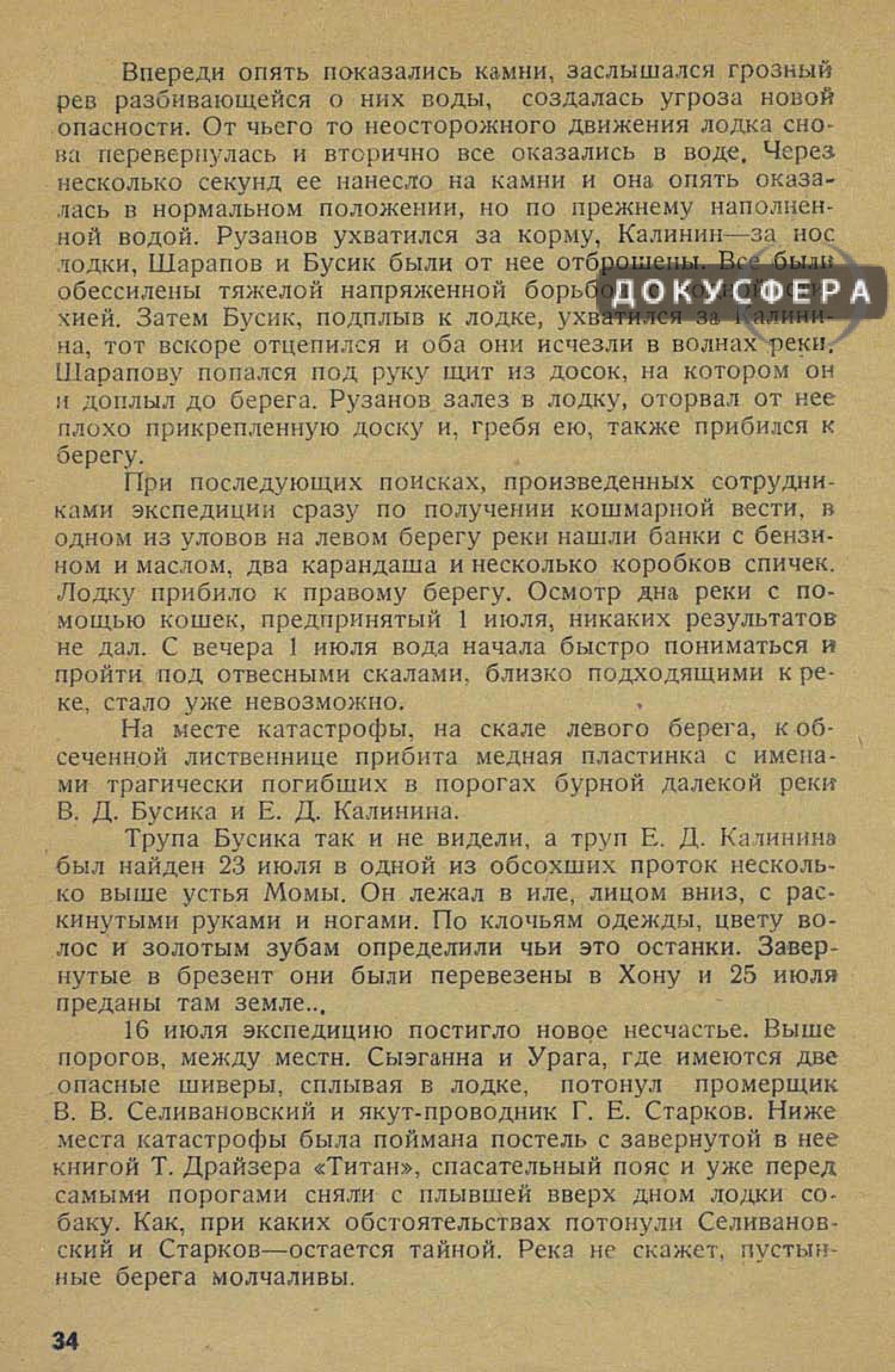 «29 июня описная партия, сплавлявшаяся от Оймякона и производившая съемку Индигирки, достигла районов порогов. Ее флотилия состояла из десятка карбазов, моторных лодок и веток /одноместная як. лодка/, на которых находилось 25 сотрудников партии и 4 тонны груза. Чтобы выяснить возможность работы на порогах и сплава через них, 30 июня в 8 час. 40 мин, выплыли для осмотра порогов в легкой моторной лодке начальник экспедиции В.Д. Бусик, его заместитель Е.Д. Калинин, моторист Я. Рузанов и старший рабочий Шарапов.