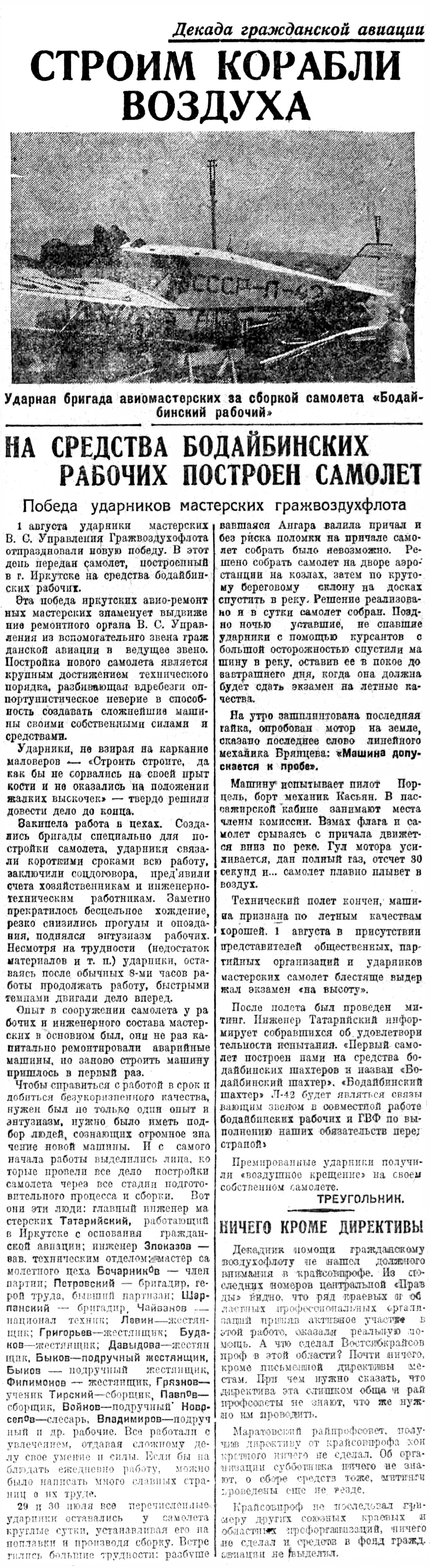 Руководитель авиодела ГВОЗДЕВ берет ответственность на себя и на деньги рабочих, руками рабочих был выстроен первенец Восточной Сибири «Бодайбинский шахтер» - Л-42 на кратком языке летчиков.