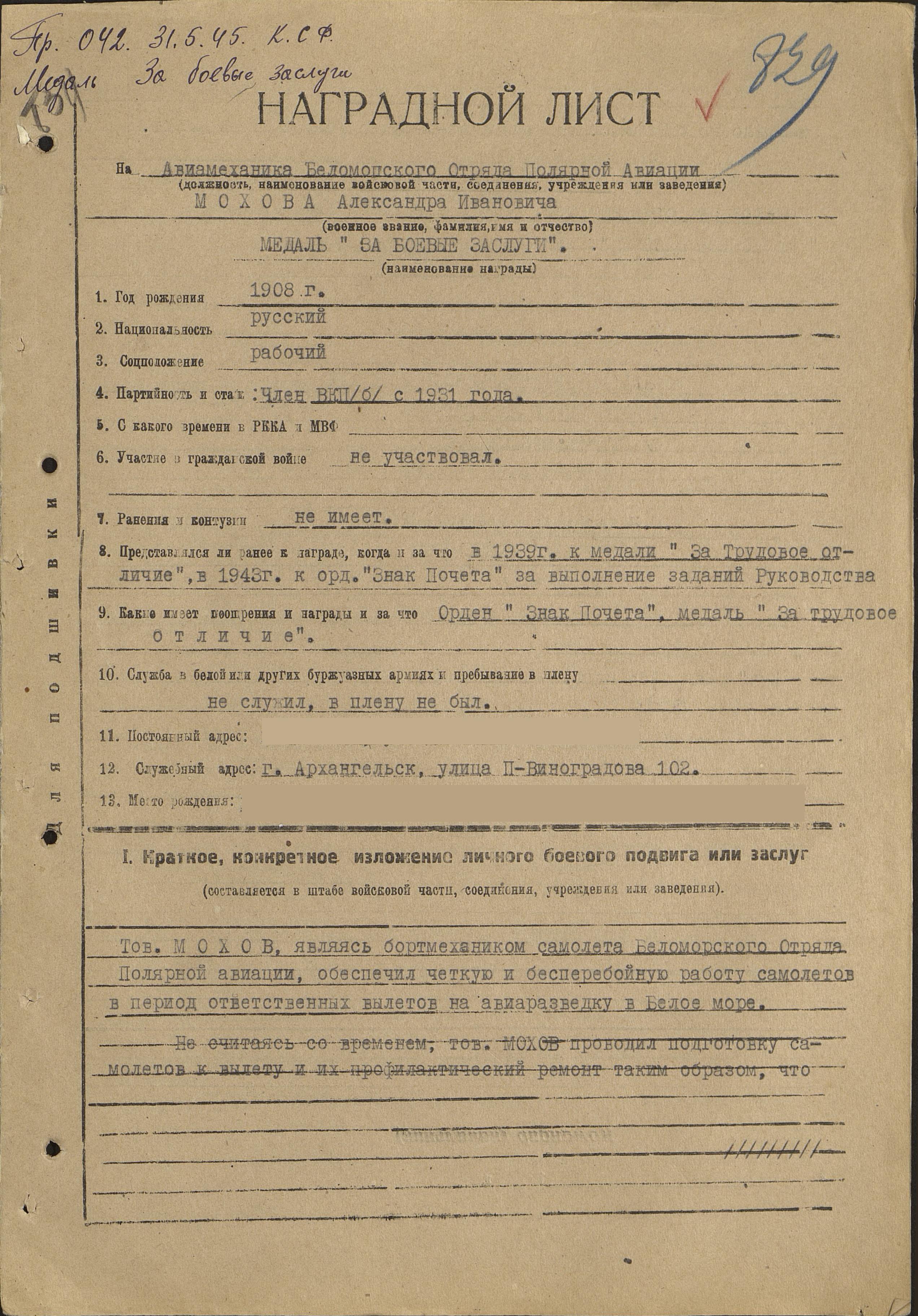 Представление на награждение СФ №: 42 от: 31.05.1945