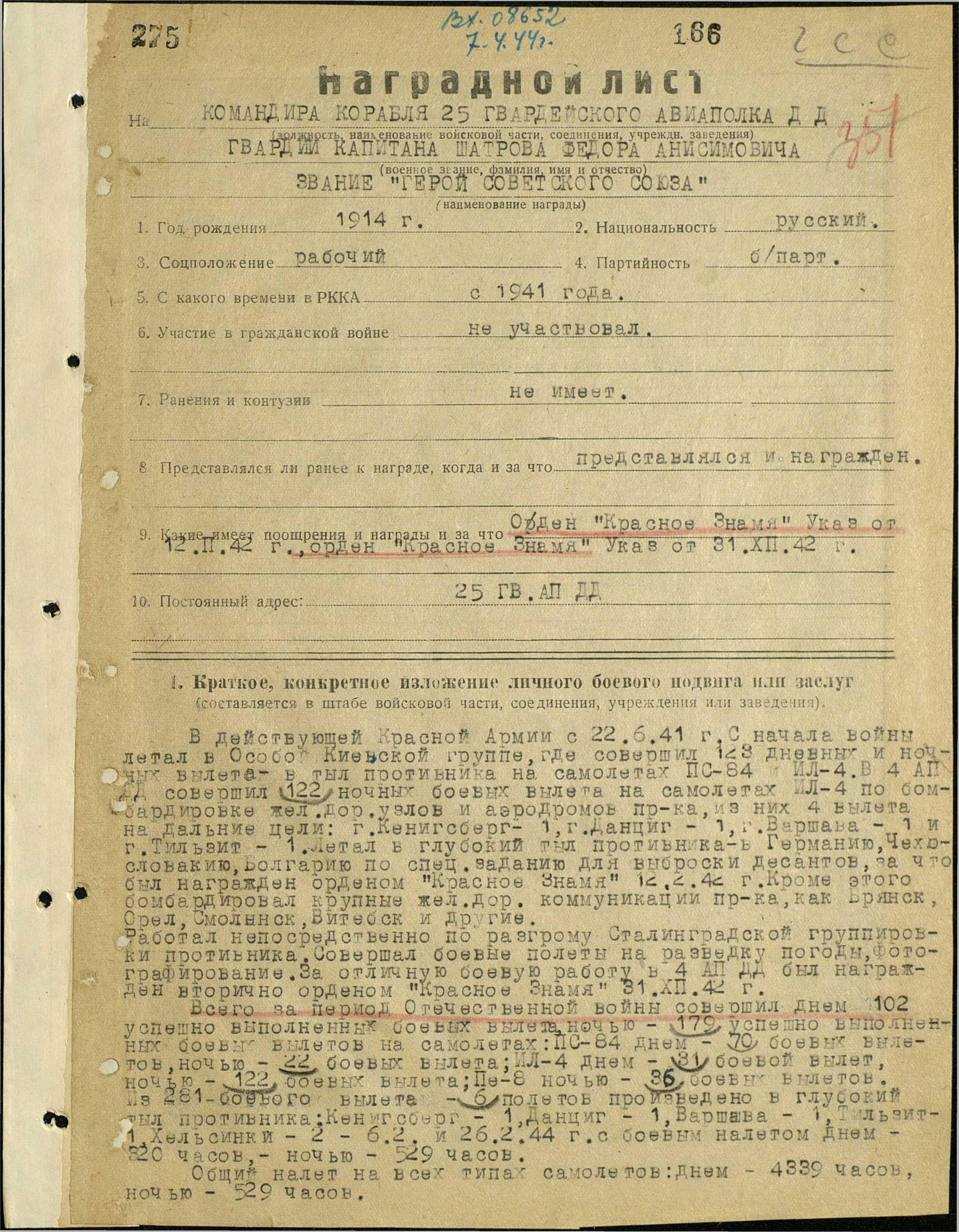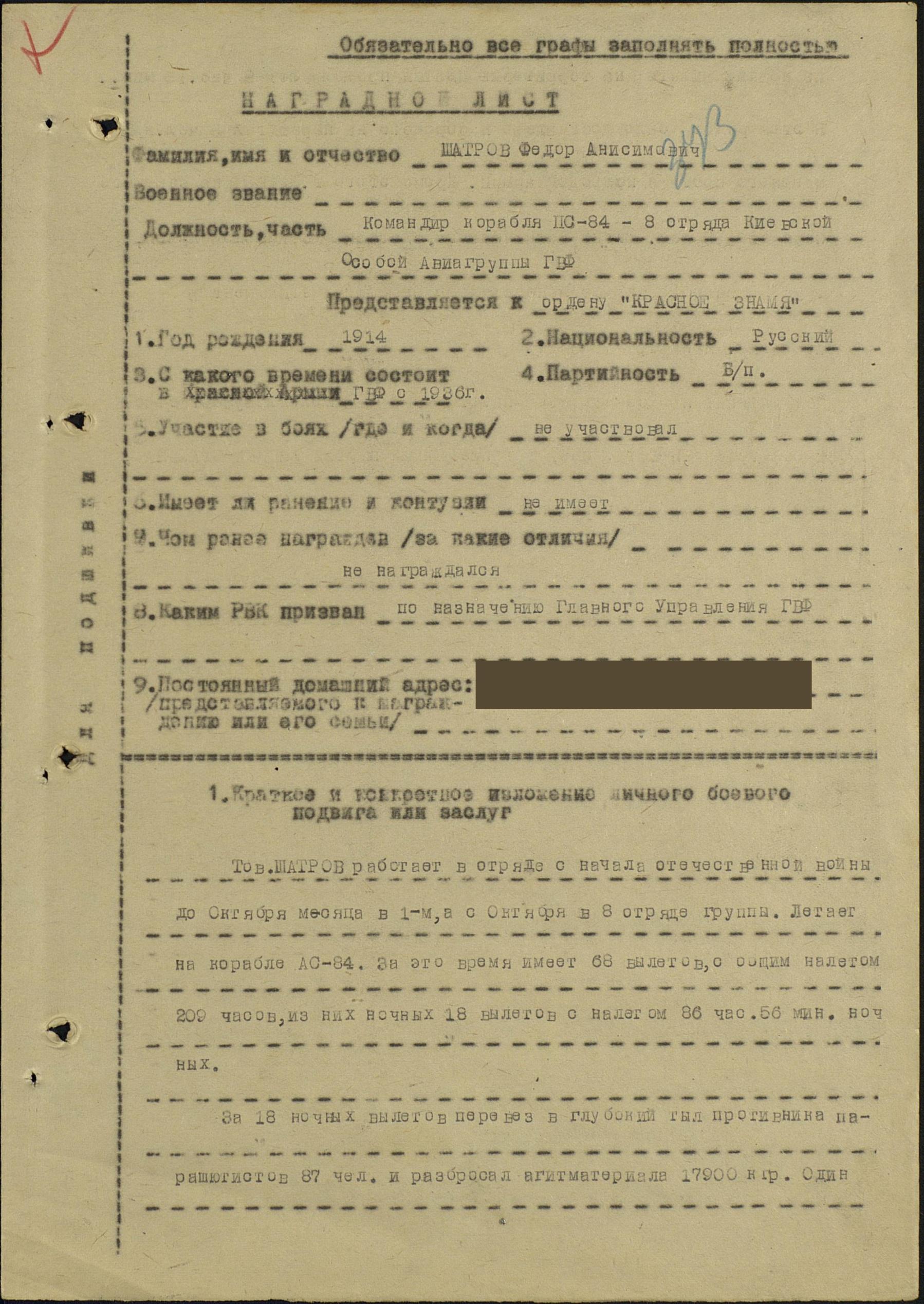 Тов. ШАТРОВ работает в отряде с начала отечественной войны до октября месяца в 1-м, а с октября в 8 отряде группы. Летает на корабле ПС-84. За это время имеет 68 вылетов, с общим налетом 209 часов, из них ночных 18 вылетов с налетом 86 часов 56 мин. ночных.
