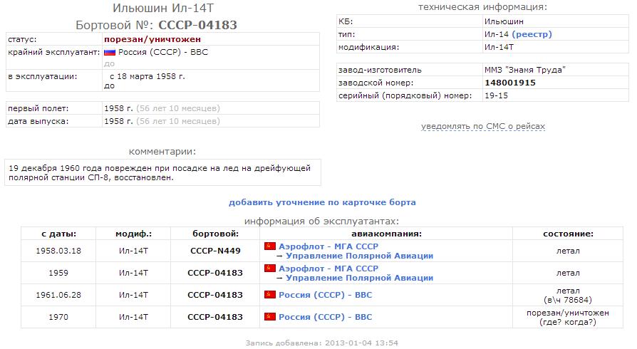 http://russianplanes.net/reginfo/40548 пишет:19 декабря 1960 года поврежден при посадке на лед на дрейфующей полярной станции СП-8, восстановлен.
