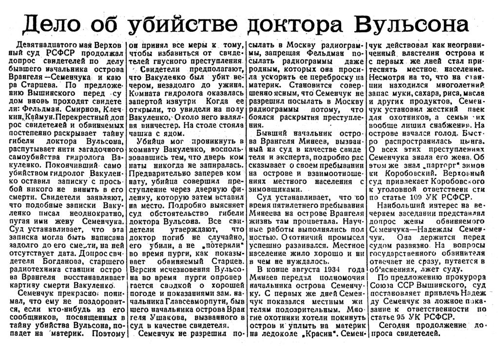 16 мая в Верховном суде РСФСР под председательством зам. председателя Верховного суда РСФСР Я. Л. Бермана началась слушание дела бывшего начальника зимовки острова Врангеля Семенчука и каюра Старцева, обвиняемых по статье 59-3 УК РСФСР. Обвинение поддерживает прокурор Союза ССР А. Я. Вышинский.