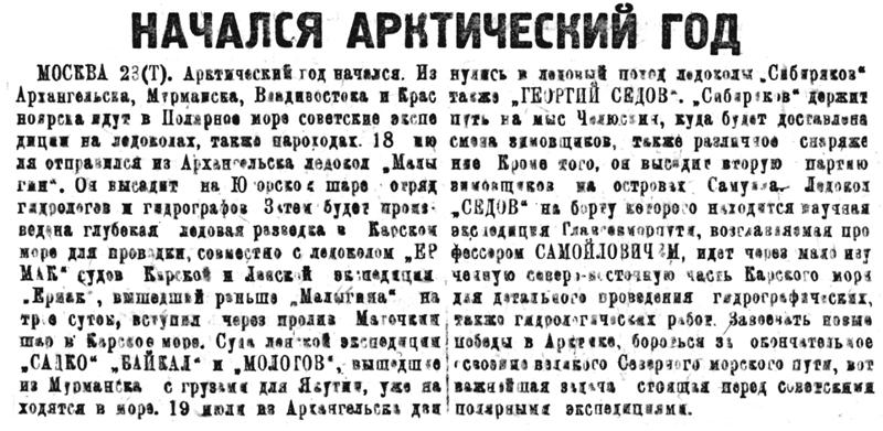 МОСКВА 23(Т). Арктический год начался. Из Архангельска, Мурманска, Владивостока и Красноярска идут в Полярное море советские экспедиции на ледоколах, также пароходах. 18 июля отправился из Архангельска ледокол "Малыгин". Он высадит на Югорском шаре отряд гидрологов и гидрографов. 3атем будет произведена глубокая ледовая разведка в Карском море для проводки, совместно с ледоколом „Ермак"