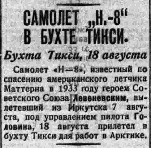 Самолет «Н—8», известный по спасению американского летчика Маттерна в 1933 году героем Советского Союза Леваневским, вылетевший из Иркутска 7 августа, под управлением пилота Головина, 18 августа прилетел в бухту Тикси для работ в Арктике.
