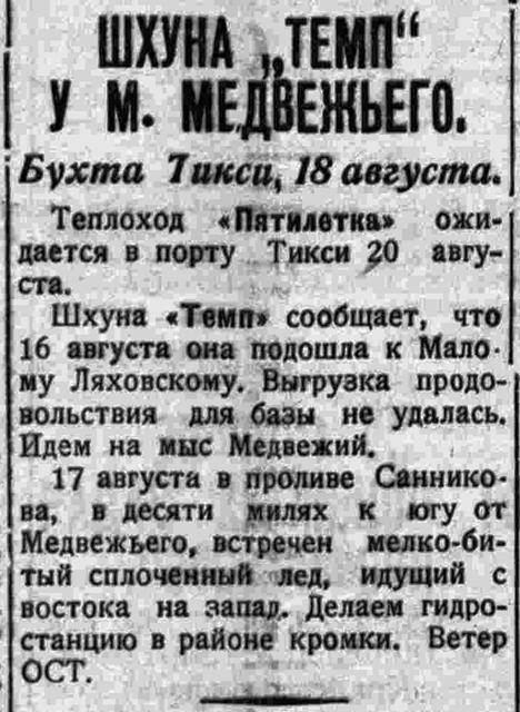 Шхуна «Темп» сообщает, что 16 августа она подошла к Малому Ляховскому. Выгрузка продовольствия для базы не удалась. Идем на мыс Медвежий.