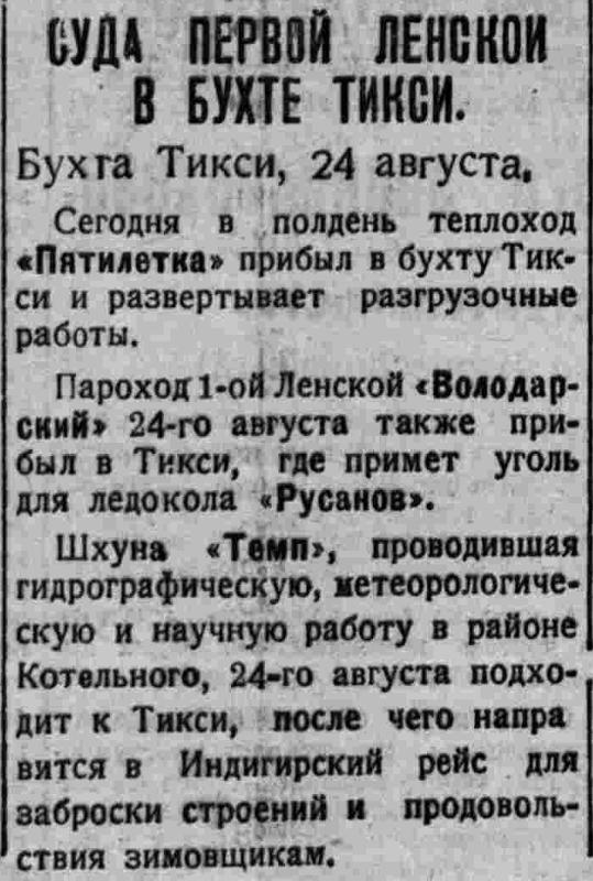 Шхуна «Темп», проводившая гидрографическую, метеорологическую и научную работу в районе Котельного, 24-го августа подходит к Тикси, после чего направится в Индигирский рейс для заброски строений и продовольствия зимовщикам.