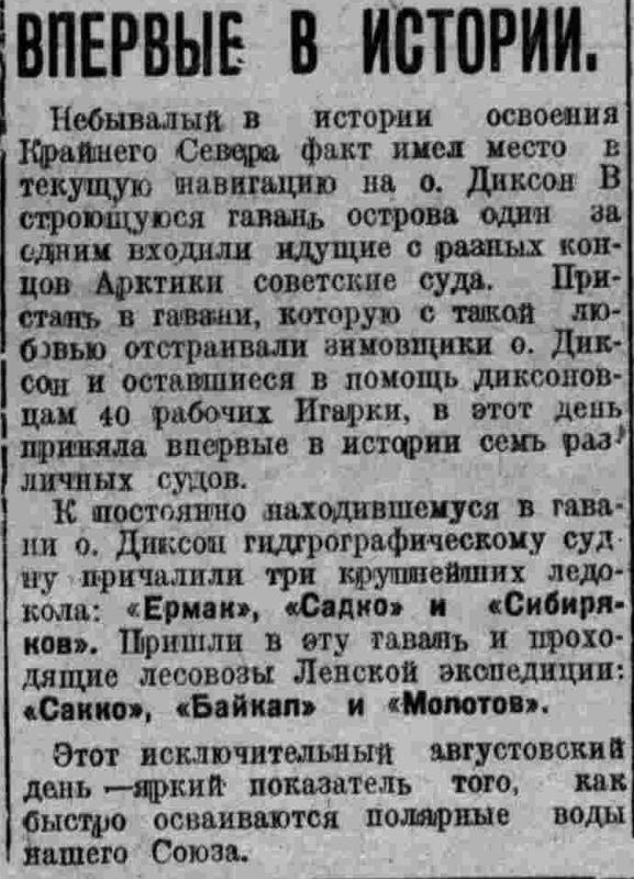 Небывалый в истории освоения Крайнего Севера факт имел место в текущую навигацию на о. Диксов В строящуюся гавань острова одни за одним входили идущие с разных концов Арктики советские суда. Пристань в гавани, которую с такой любовью отстраивали зимовщики о. Диксом и остающиеся в помощь диксоновцам 40 рабочих Игарки, в этот день приняла впервые в истории семь различных судов.