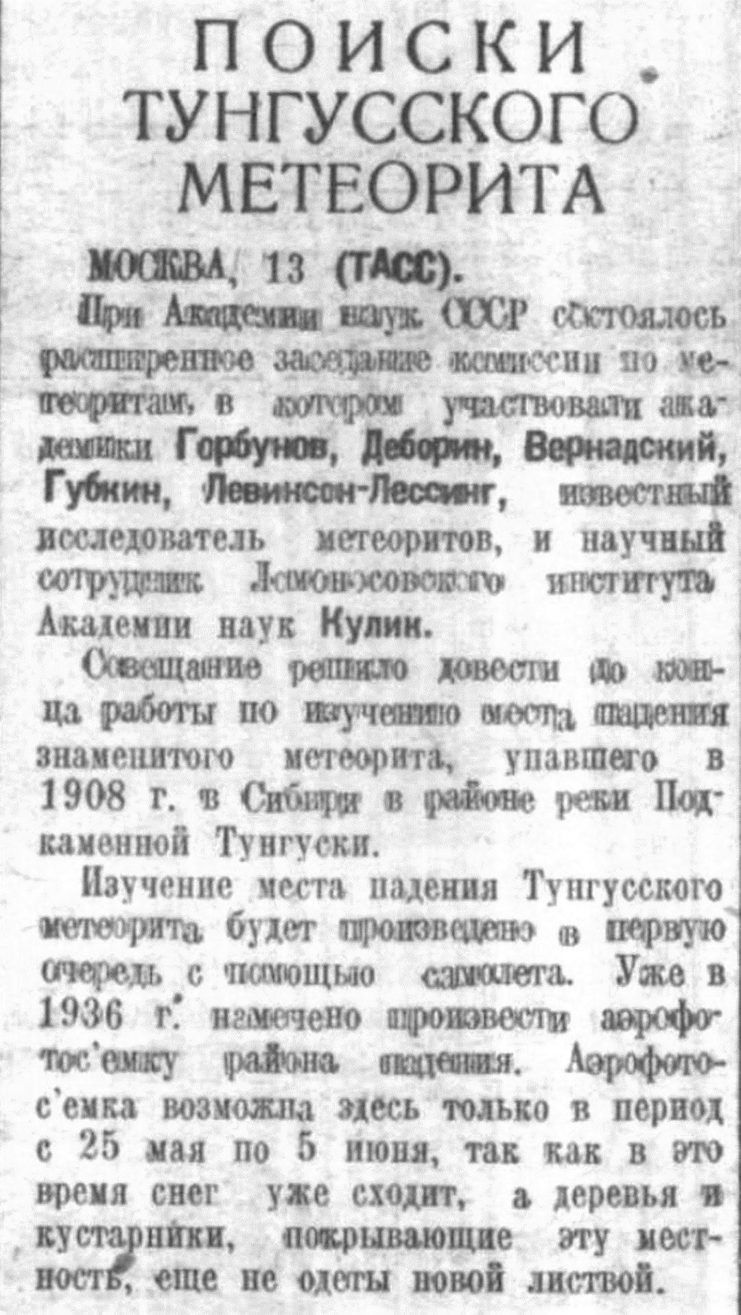 При Академии наук СССР состоялось расширенное заседание комиссии по метеоритам, в котором участвовали академики Горбунов, Деборин, Вернадский, Губкин, Левинсон-Лессинг, известный исследователь метеоритов, и научный сотрудник Ломоносовского института Академии наук Кулик.