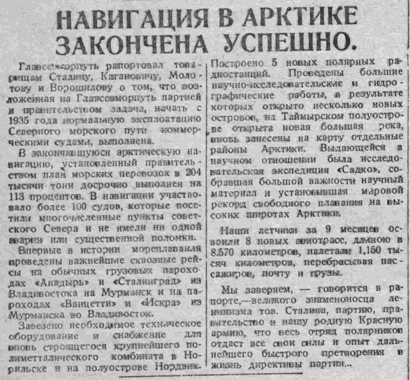 Главсевморпуть рапортовал товарищам Сталину, Кагановичу, Молотову и Ворошилову о том, что возложенная на Главсевморпуть партией и правительством задача, начать с 1935 года нормальную эксплоатацию Северного морского пути коммерческими судами, выполнена.