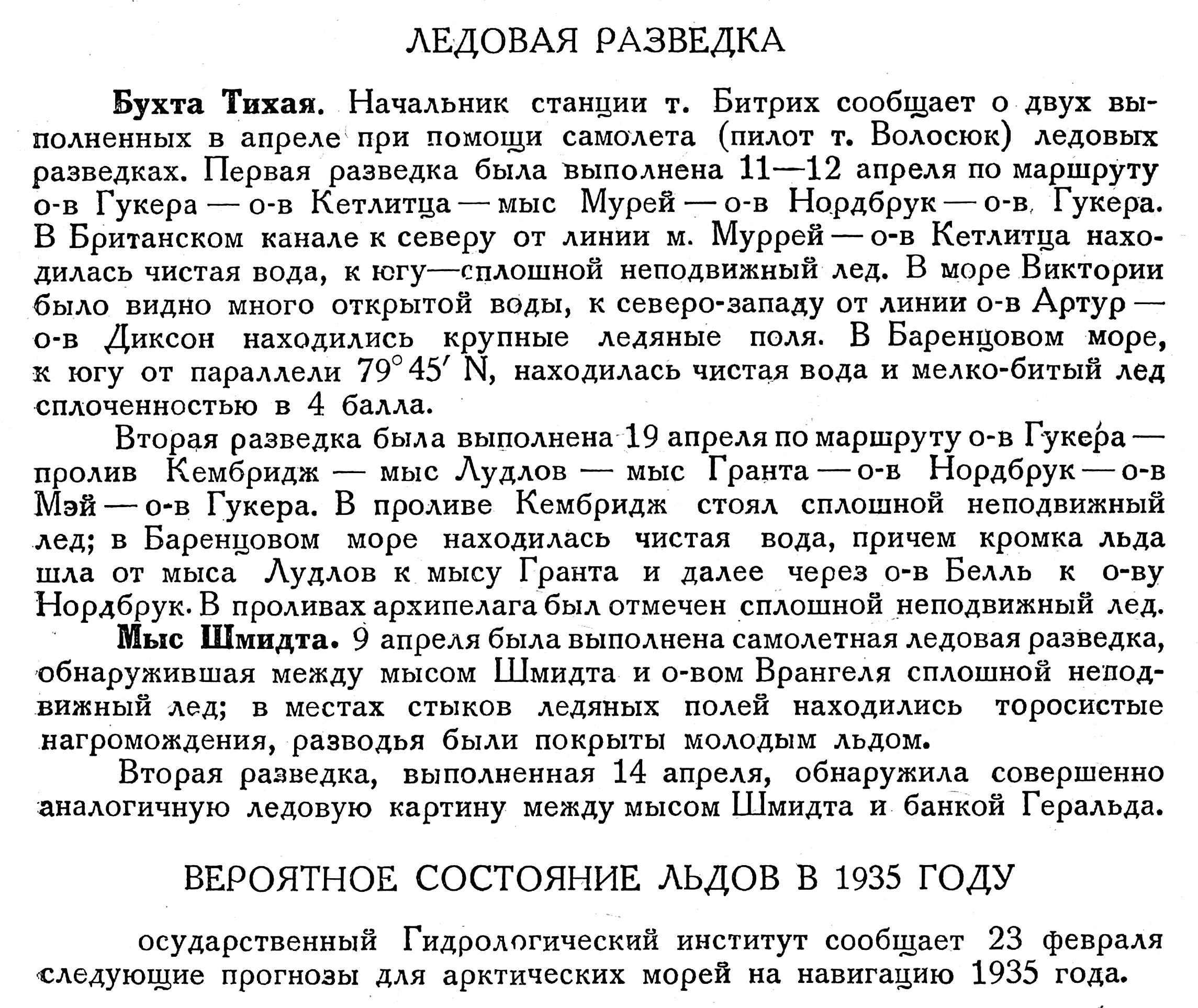 Мыс Шмидта. 9 апреля была выполнена самолетная ледовая разведка, обнаружившая между мысом Шмидта и о-вом Врангеля сплошной неподвижный лед; в местах стыков ледяных полей находились торосистые нагромождения, разводья были покрыты молодым льдом.
