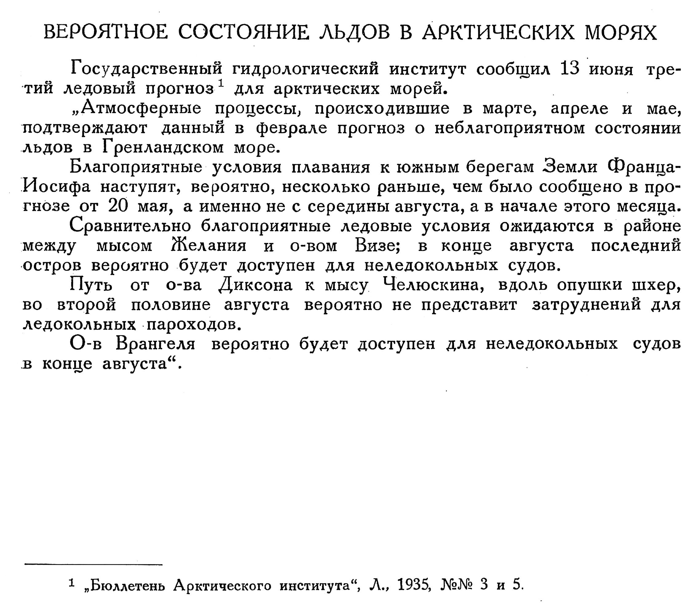 Государственный Гидрологический институт сообщил 19 мая следующий прогноз состояния льдов в арктических морях. В северовосточной части Карского моря в августе ожидается большое количество льда. Тем не менее условия навигации на участке Диксон — мыс Челюскина не будут тяжелее, чем в 1934 г., а подход к западным берегам Северной Земли будет, вероятно, легче.