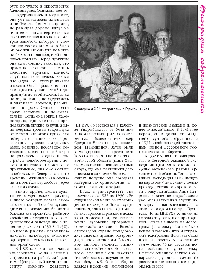 В 1932 г. Анна Петровна работала в Северной сельдяной экспедиции ЦНИРХа в селе Долгощелье Мезенского района Архангельской области. Тогда готовилась экспедиция О. Ю. Шмндта на пароходе "Челюскин" с целью прохода Северного морского пути в одну навигацию. Анна Петровна в качестве гидробиолога уже была включена в группу зимовщиков, направлявшихся с этим пароходом на остров Врангеля. Но из ЦНИРХа ее никак не хотели отпускать, и ей приходилось бегать на лыжах из Долгощелья (поскольку там не было почты) в г. Мезень. чтобы отправлять телеграммы. Получать отказ и снова просить. А расстояние там — около 40 км. Здесь мы пока поставим точку, поскольку в нашем семейном архиве я обнаружила рукопись маминого рассказа о том. как она все же добилась своего.