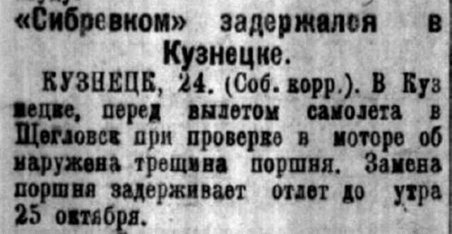 КУЗНЕЦК, 24. (Соб. корр.). В Кузнецке, перед вылетом самолета в Щегловск при проверке в моторе обнаружена трещина поршня. Замена поршня задерживает отлет до утра 25 октября.