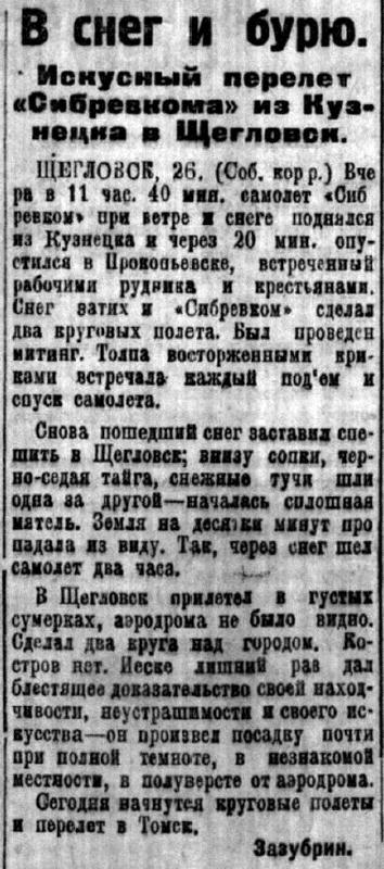 ЩЕГЛОВСК, 26. (Соб. корр.) Вчера в 11 час. 40 мин. самолет "Сибревком" при ветре и снеге поднялся из Кузнецка и через 20 мин. опустился в Прокопьевске, встреченный рабочими рудника и крестьянами. Снег затих и «Сибревком» сделал два круговых полета. Был проведен митинг. Толпа восторженными криками встречала каждый подъем к спуск самолета.