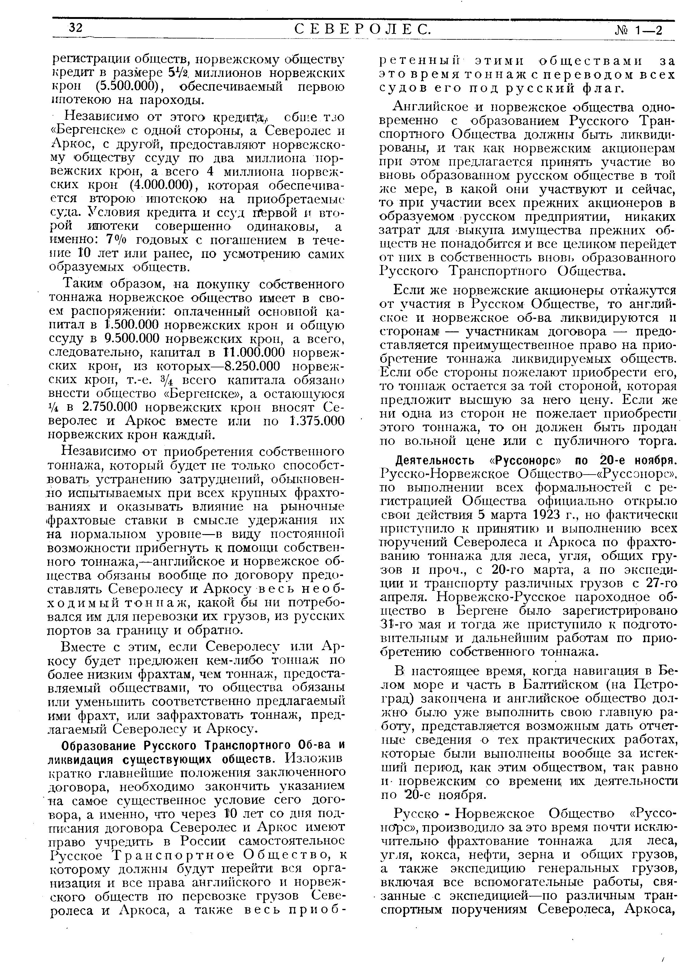 Имея в своем распоряжении такой весьма, для нынешних условий, значительный собственный тоннаж и находясь в тесных договорных отношениях с Бергенской Компанией, обладающей тоннажем в 45 пароходов общей грузоподъемностью в 120. 000 тонн, Русско-Норвежское Мореходное Общество с будущей навигации выступит на лондонском фрахтовом рынке в качестве одной из наиболее мощных организаций морского транспорта. Выступление такой организации, находящейся под преобладающим русским влиянием, будет иметь, несомненно, весьма благоприятные результаты, прежде всего, в смысле оздоровления атмосферы фрахтований под русские грузы путем введения принципов здоровой конкуренции с теми иностранными предприятиями, которые, пользуясь расхищением нашего торгового флота, пытаются извлечь из этого максимальную для себя выгоду.