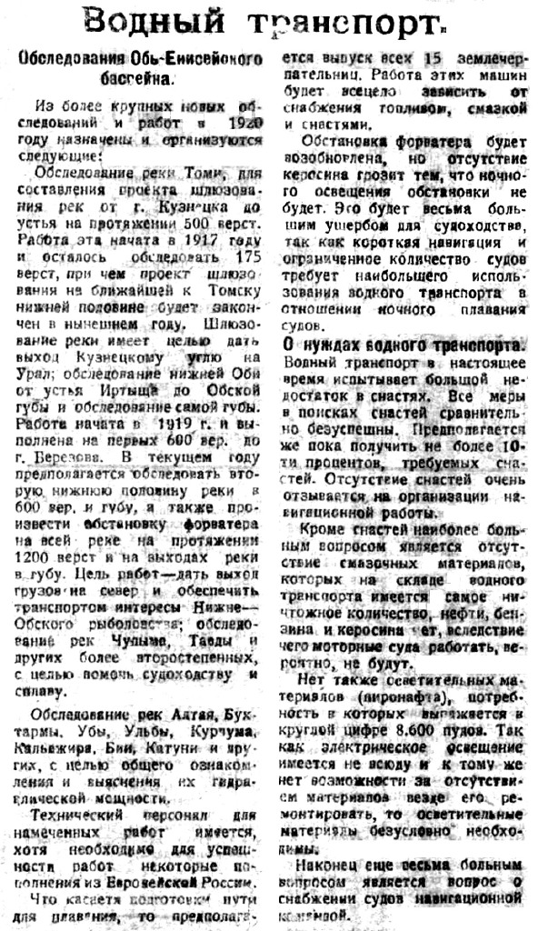 Нужно упомянуть при этом, что в интересах развития транспорта на северном морским пути, Комсеверпути весной 1920 г. поднял вопрос о переброске на Обь и Енисей части судов Архангельской флотилии. Вопрос этот в свое время обсуждался в Междуведомственной Комиссии при Наркомвнешторге и было вынесено постановление о необходимости переброски из Архангельска в Обь и Енисей 9 пароходов и 15 барж-лихтеров, при чем есть надежда на выполнение указанной переброски в нынешнем году, хотя-бы частично.