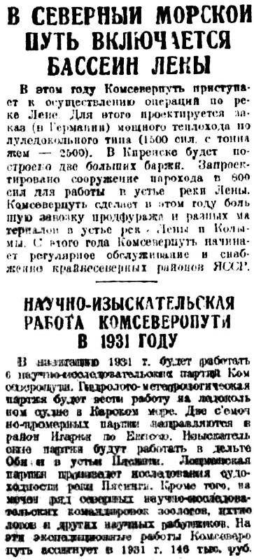 В этом году Комсеверпуть приступает к осуществлению операций по реке Лене. Для этого проектируется заказ (в Германии) мощного теплохода полуледокольного типа (1500 сил. с тоннажем — 2500). В Киренске будет построено две больших баржи. Запроектировано сооружение парохода в 800 сил для работы п устье реки Лены. Комсеверпуть сделает в этом году большую завозку продфуража и разных материалов в устье рек Лени и Колымы. С этого года Комсеверопуть начиняет регулярное обслуживание и снабжение крайнесеверных районов ЯССР.